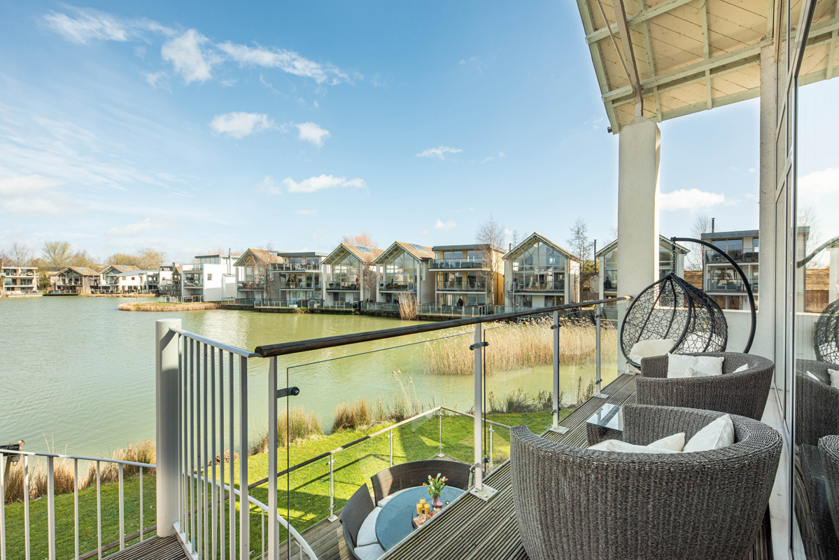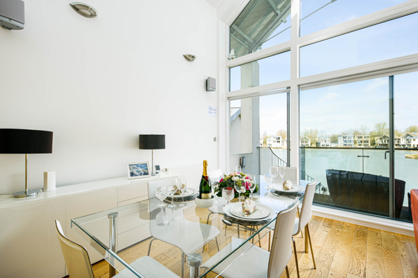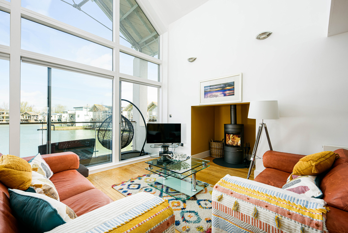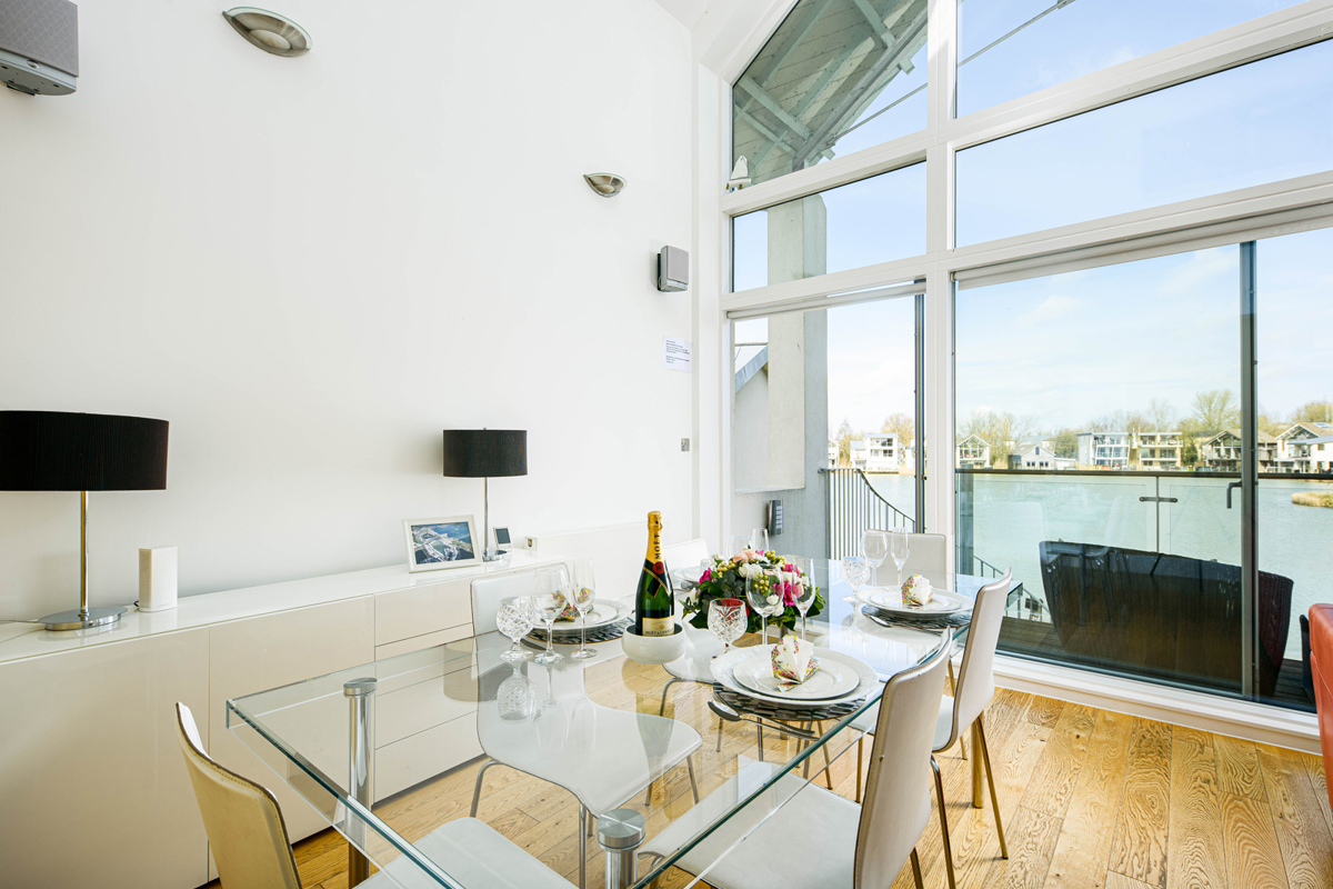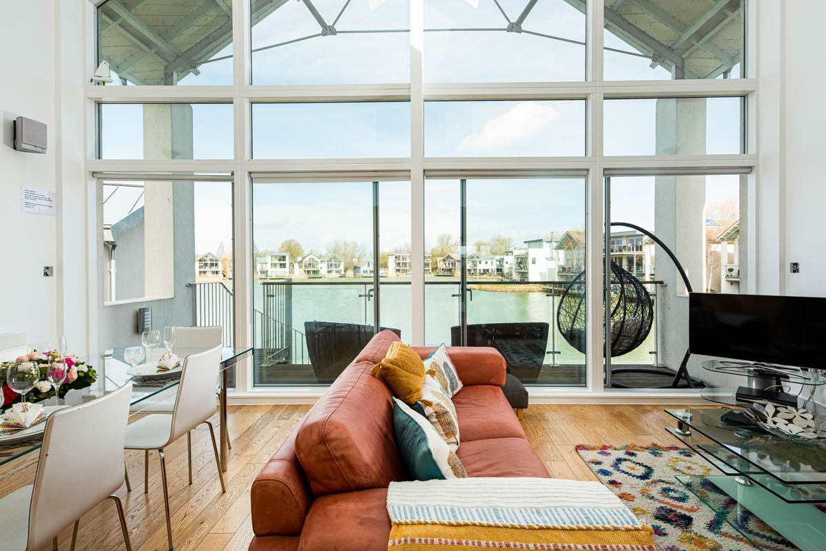 The airy lounge and dining space bathe in natural light, boasting a double height vaulted ceiling with full height glazed glass windows and sliding doors leading to the balcony. From here, use the external spiral staircase to reach the ground floor deck for lakeside entertaining.