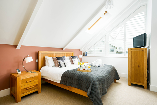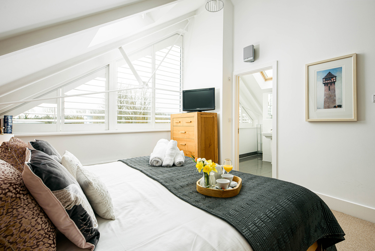 Continuing up the stairs further to the top floor, you reach the pinnacle of the house, a spacious mezzanine turned into a beautiful loft bedroom drenched in light from all sides including Velux windows in the roof. Imagine your mornings here, unfolding peacefully as you soak up the sunshine. The king size bedroom is your haven, complete with spacious ensuite shower room and adorned with white plantation shutters for serene nights. Unpack your belongings and delve into a curated selection of books provided by the owner for leisurely holiday reading.