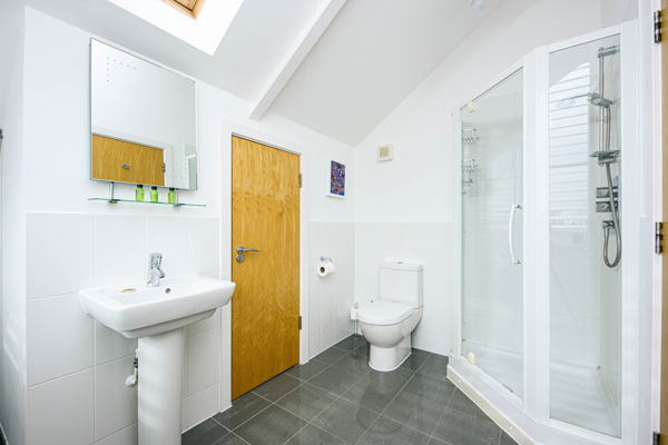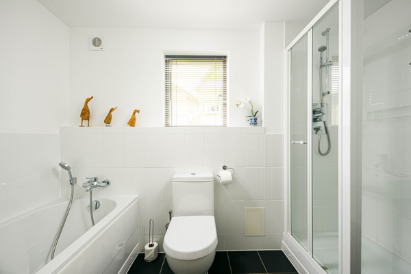 To your left, discover a family bathroom, complete with a rejuvenating shower and a deep inviting bathtub – ideal for washing away the day’s lake adventures.