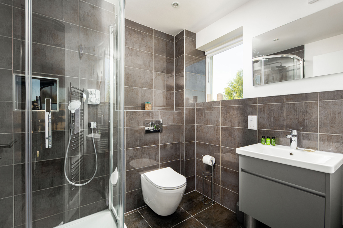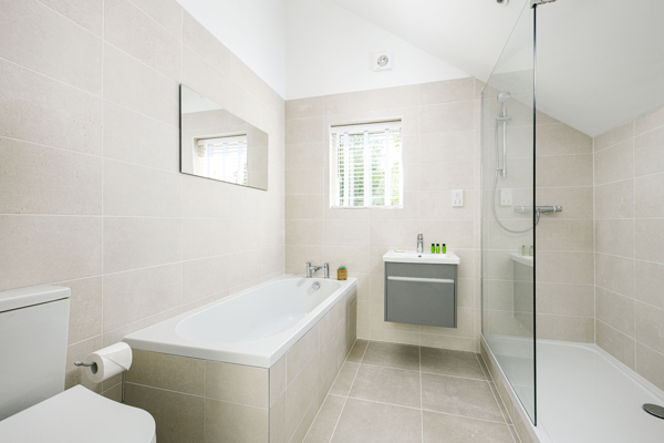A family bathroom, complete with a shower over bath, caters to the needs of guests with simplicity and ease.