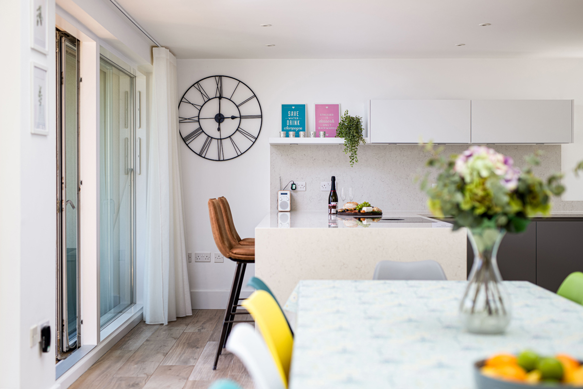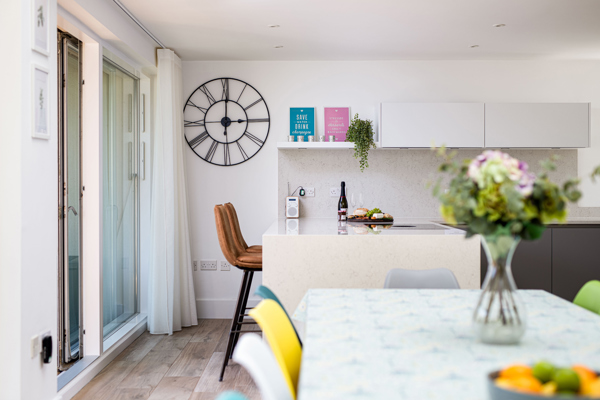 Adjoining the dining area, you will find a sleek kitchen with granite worktops is a culinary haven. The kitchen houses plenty of bin options for the eco conscious recycler and features high quality appliances such as a double oven, integrated full-sized fridge and dishwasher, induction cooktop, coffee machine, and a convenient Quooker hot water tap. Whether opting for a hot brew from the tap or preferring a good old-fashioned ‘cuppa’ made from a kettle, this kitchen is abundantly stocked for all your entertaining and culinary requirements.