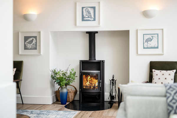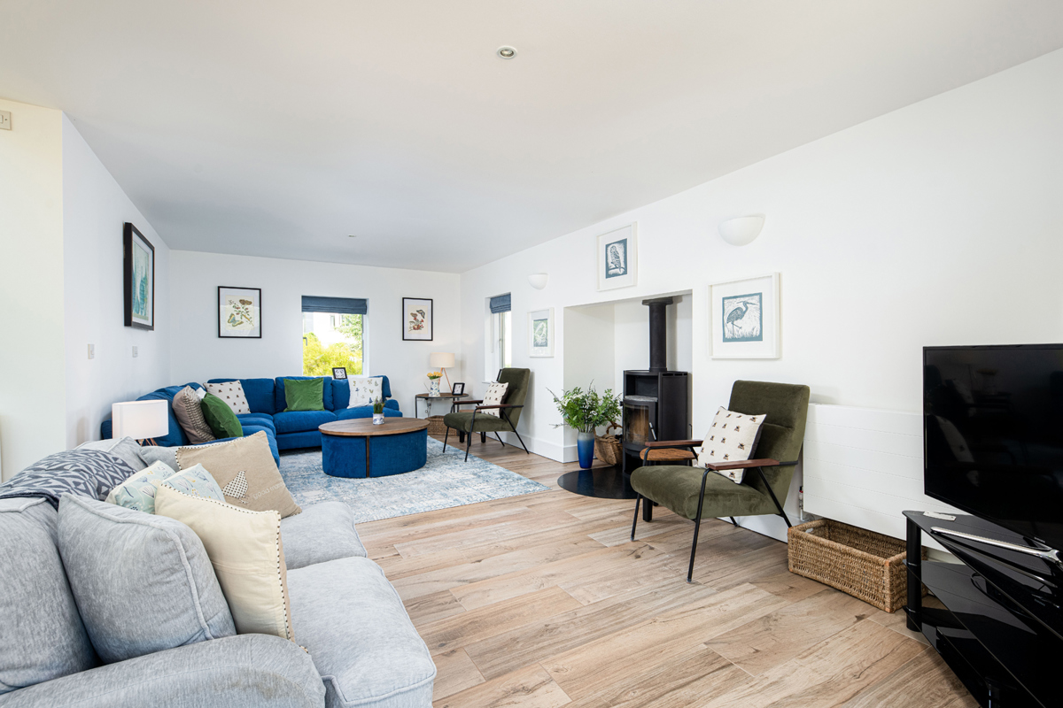 Completing the ground floor experience is an inviting and cosy lounge area, where conversation flows effortlessly, and entertainment thrives. With a TV, Blu-ray DVD player (feel free to bring your favourite DVDs), sound bar and a wood burner the heart of this space, evenings here are destined to be cherished.