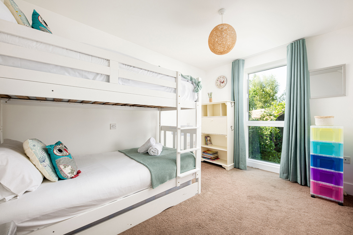 To your right, you’ll discover a tastefully decorated bunk bedroom with pull out trundle bed underneath, adorned with bright artwork, colourful drawers, and a bookshelf housing a small collection of children's stories, along with space to also bring your children's own favourite books.