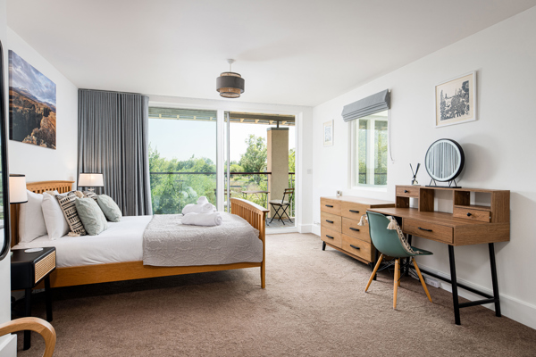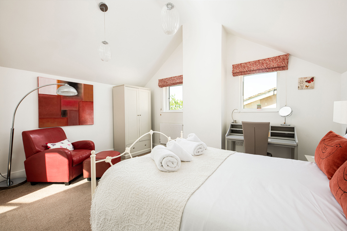 The final bedroom to the left of the landing is a spacious loft double bedroom offering a wardrobe, dressing area, and a writing desk.