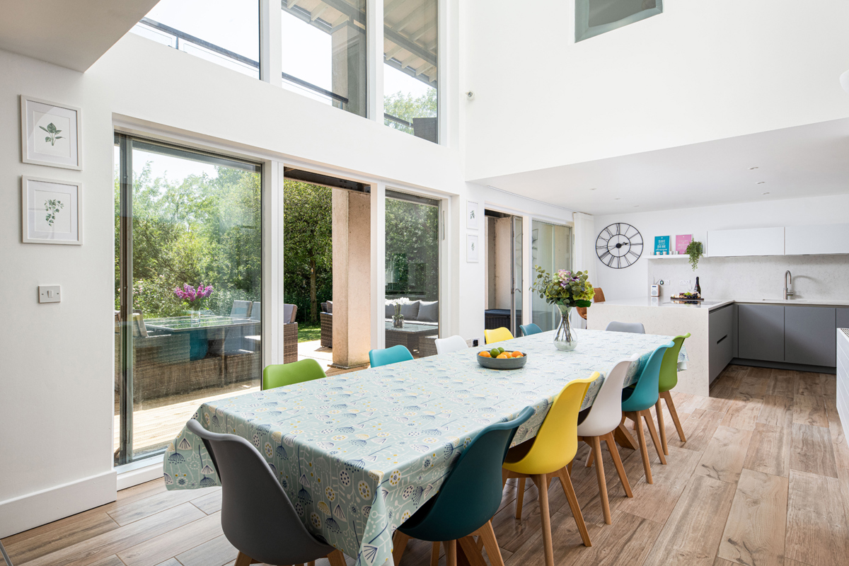 From the entryway, pass through the inviting double doors, and be greeted by a spacious and light open plan living area with glass windows and doors that span the entire length of the house. An impressively long dining table, perfect for hosting gatherings of up to 12 guests, sits under a full height central atrium awash with natural light.