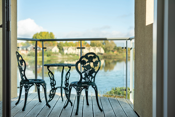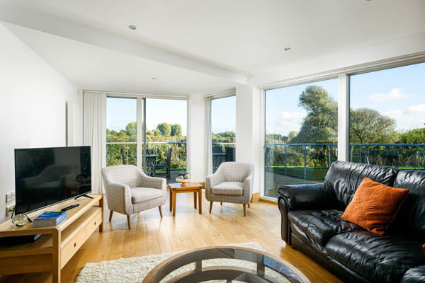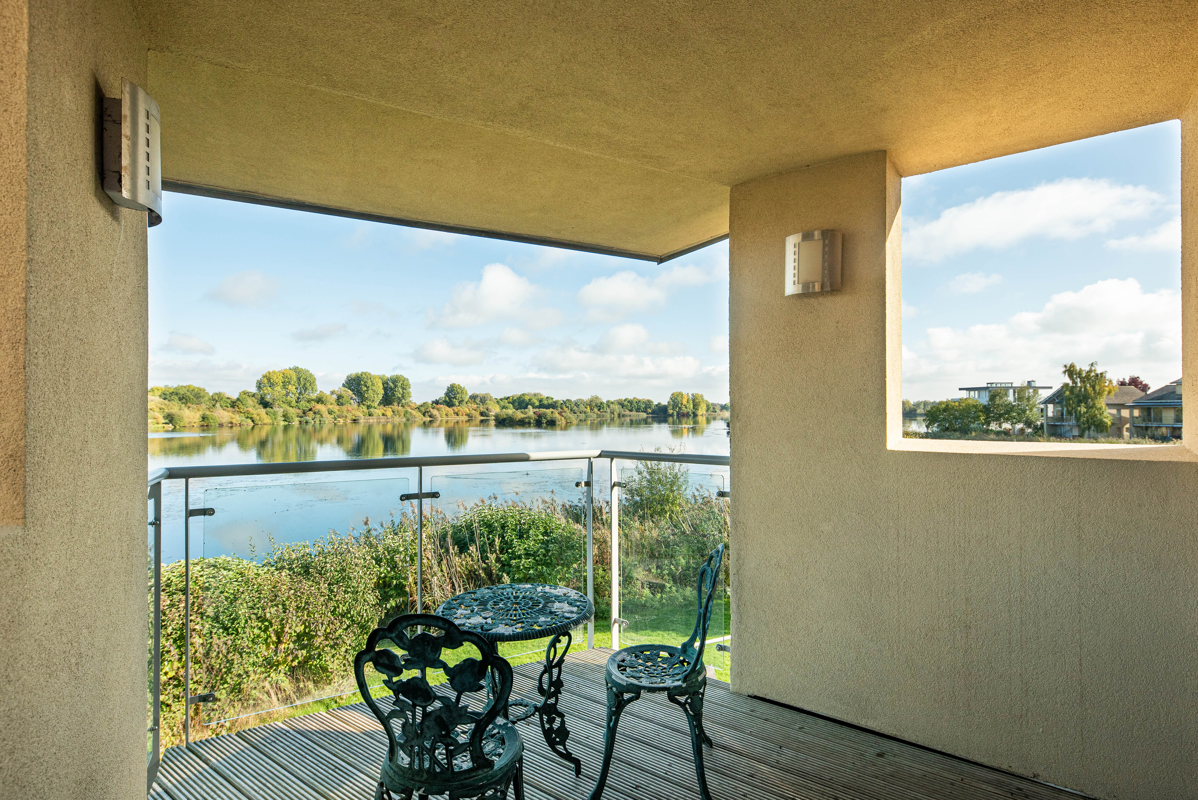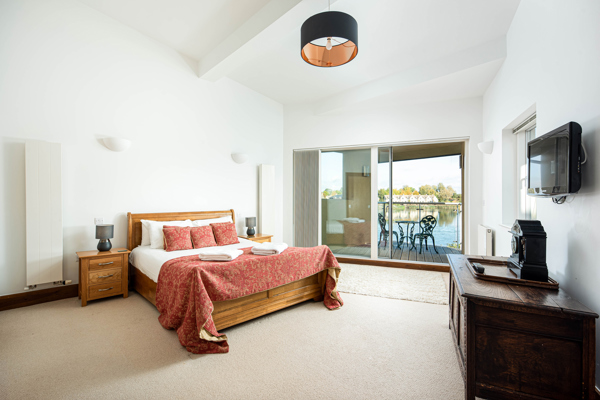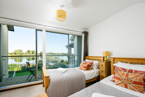 Immediately left at the top of the stairs is an impressively sized master bedroom with en-suite shower room, built in robes and direct access onto a private balcony with stunning views across Somerford Lagoon. Watch the TV, delight in the sunrise from bed, or perhaps take a moment with your cuppa on the private balcony each morning as the birds dip and skim across the lake. Waking up here is the stuff holidays are made of.
