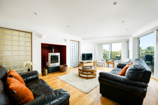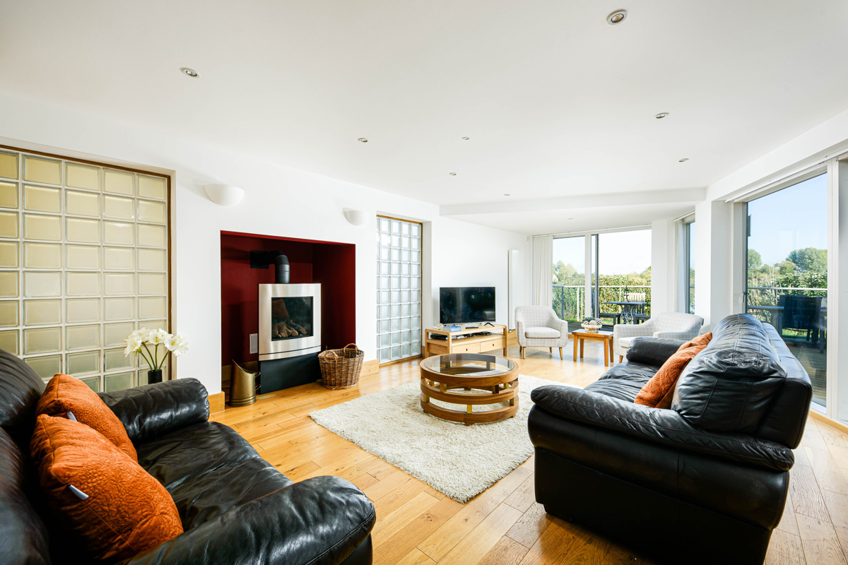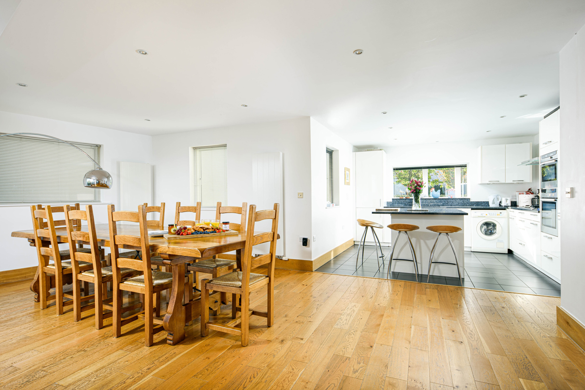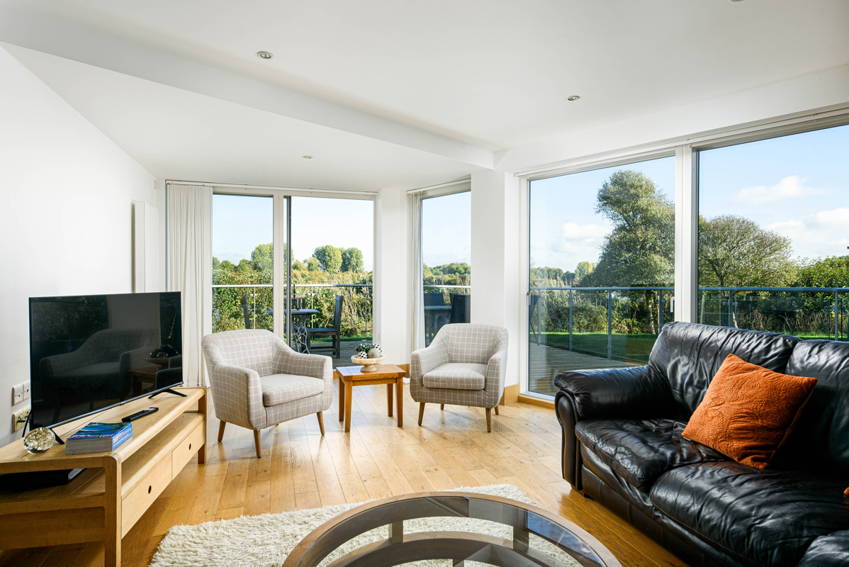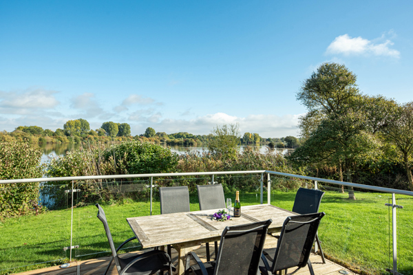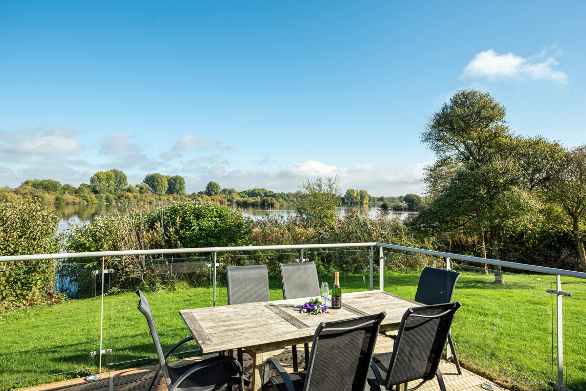 Sliding doors lead out onto a large, fully glass-enclosed private timber deck with two dining tables and views out to the garden and Somerford Lagoon beyond - this is a rare and desirable feature for a property with direct lake access as provides peace of mind for those staying with young children.