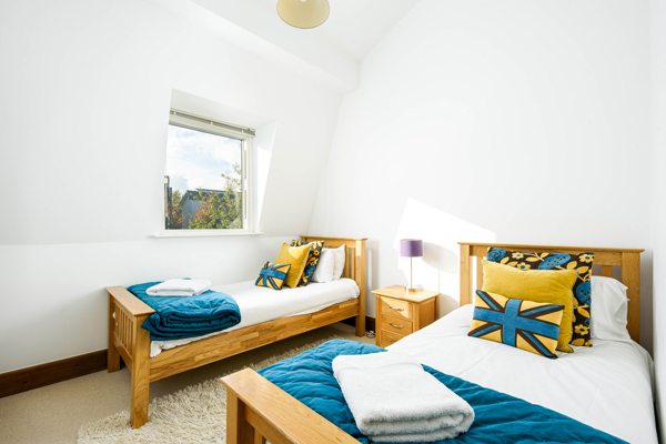 A smaller twin bedroom also with built in robes and its own private balcony with beautiful lake views is across the landing.