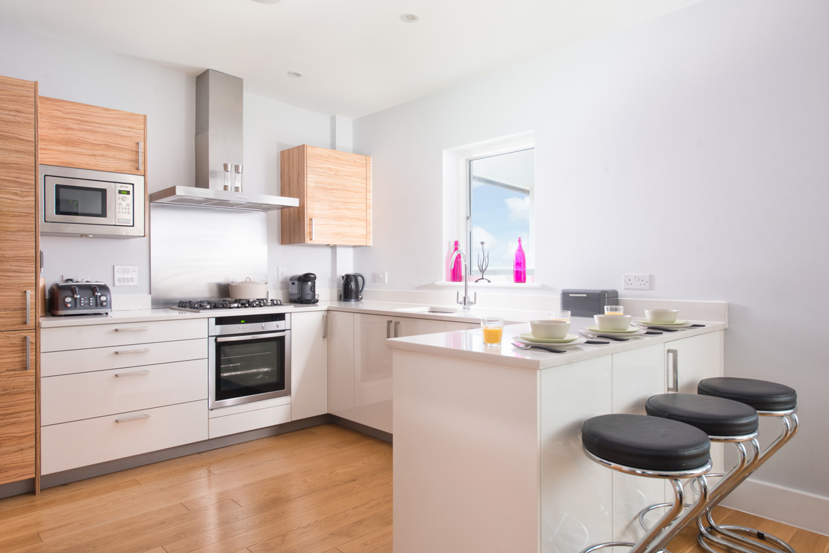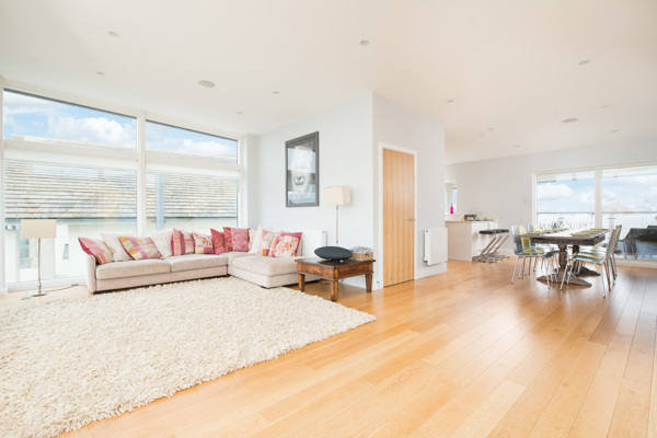 On the top floor, you will find a spacious open living area comprising a fully equipped kitchen with a single oven, built-in microwave, dishwasher, fridge/freezer, and Nespresso machine, which takes Vartua capsules. Good range of wall and base cupboard units, separate larder cupboard.