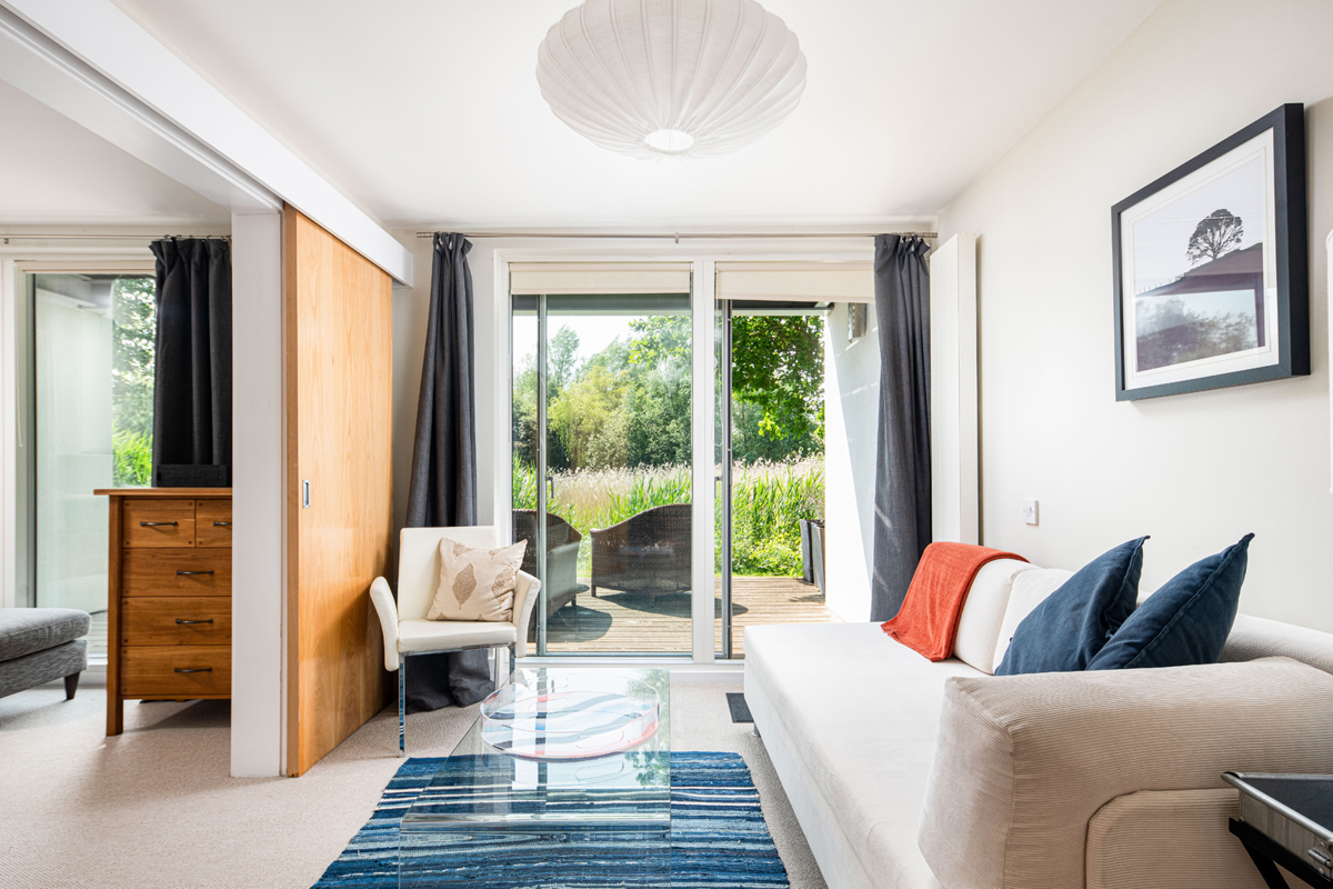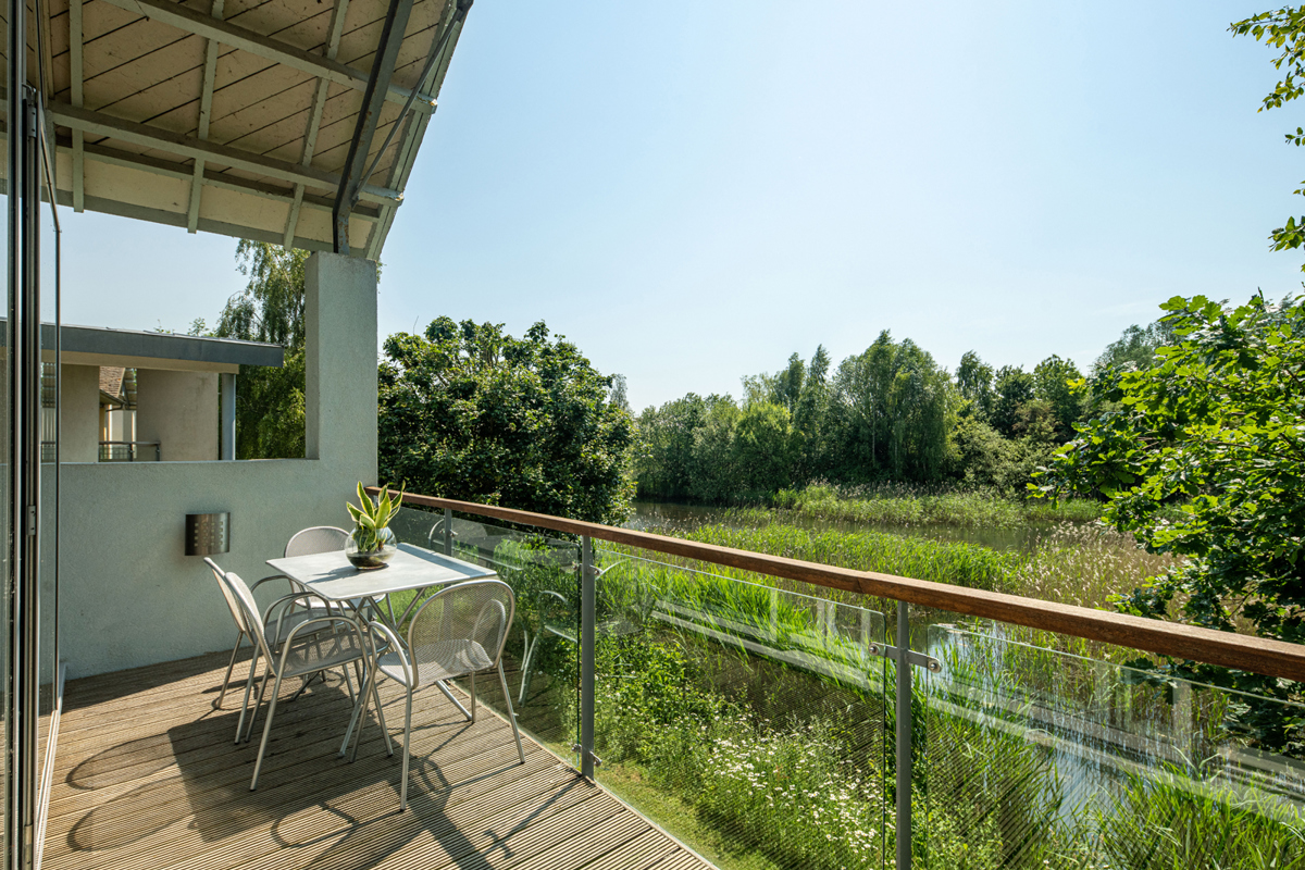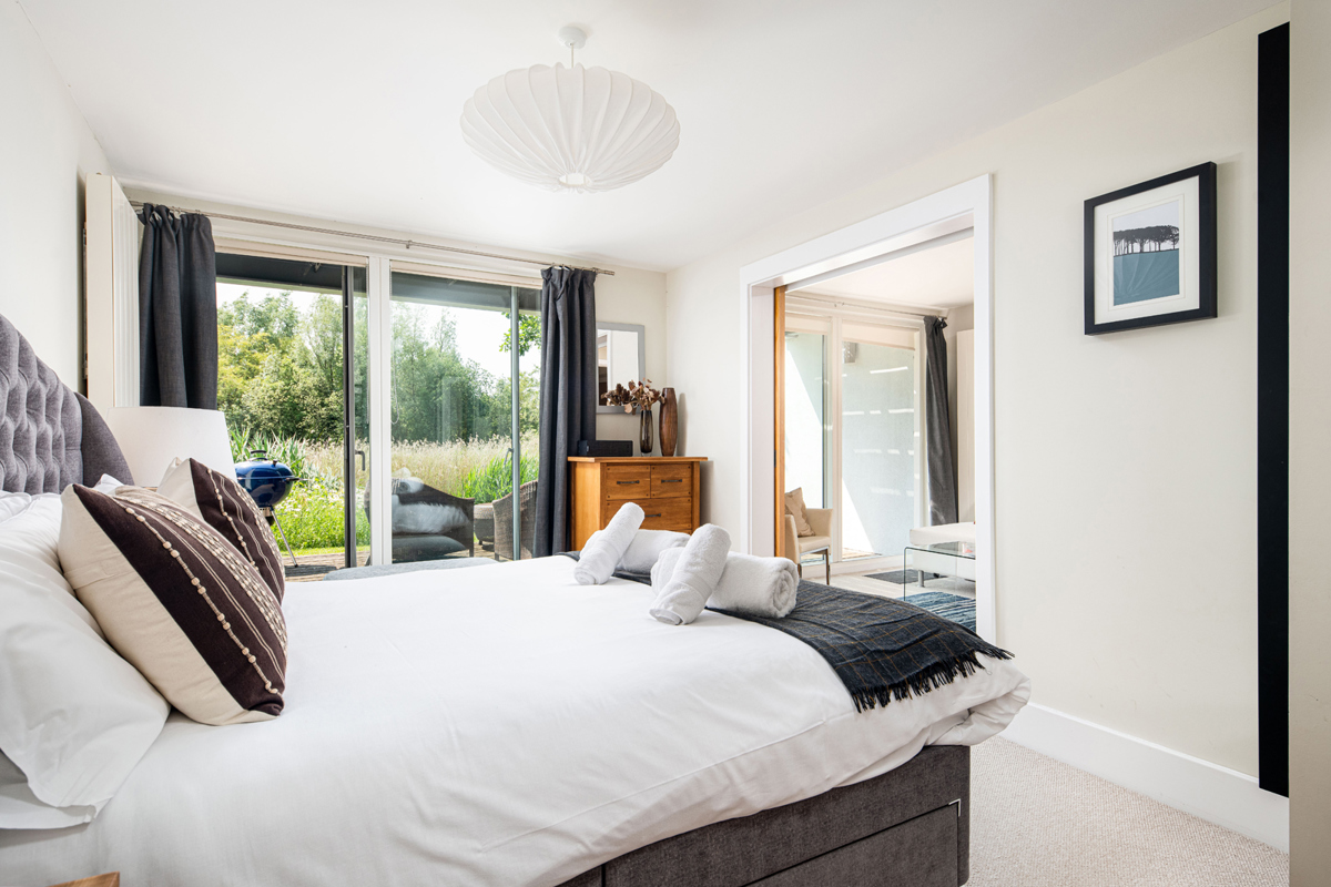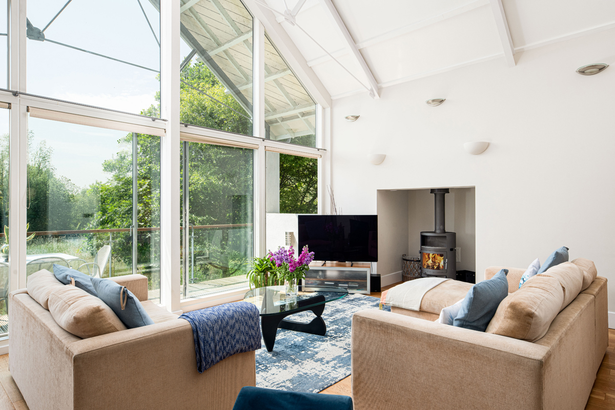 The lounge features a central wood burner for the colder seasons, and an impressive double height vaulted ceiling with full height glazed windows. Slide open the glass doors onto the south facing balcony and pull up a seat to be soothed by the swaying reeds and surrounding mature trees as they create a captivating backdrop. Grab the binoculars (the owners really have thought of all the touches) and let the estate’s abundant wildlife enchant you.