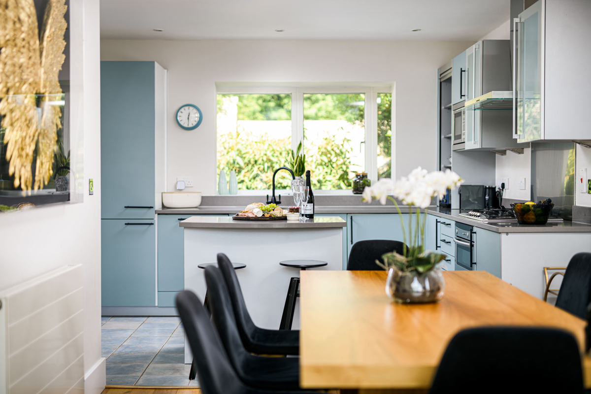 The kitchen overlooks a sophisticated dining area with a table for eight guests and a drinks cart to create a finer dinner party experience.