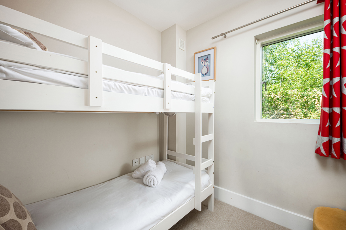 There is a children’s bunk bedroom designed with young ones in mind. The bunk is a shorty bed and smaller than full sized singles.