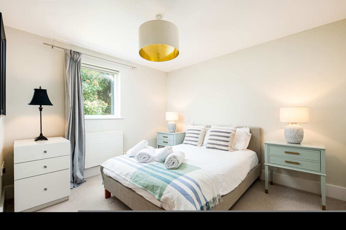 Discover a double bedroom with drawers and a built-in hanging robe, tastefully decorated in a calming colour palette.
