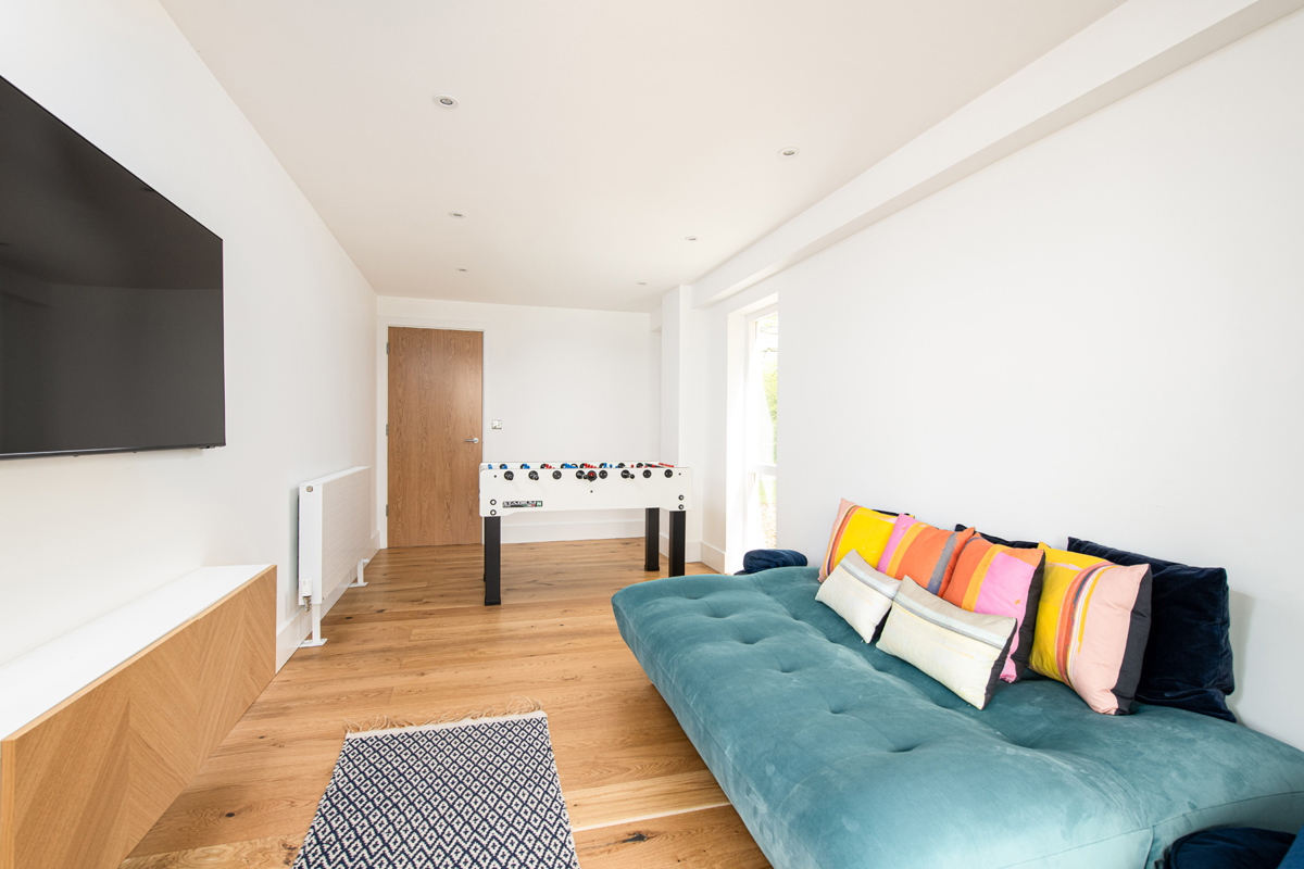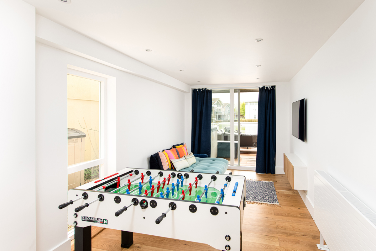Beyond the boot room you will find ‘The Den’, a vibrant convergence of recreation and relaxation. Feel the pulse quicken as you play a match on the full-size football table, bask in natural light on the comfy sofa, and close the curtains to relax with a touch of entertainment on the wall mounted TV.