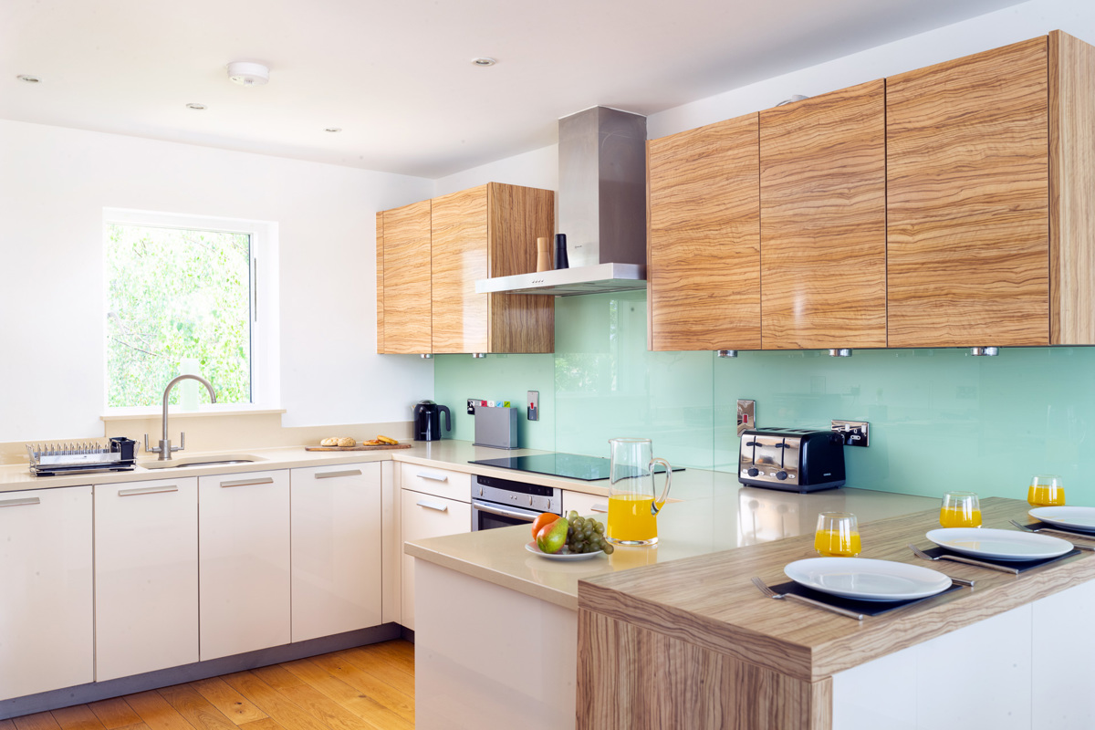 Back inside, the practical kitchen has ample bench space and a breakfast bar with two stools. Fully equipped, stocked and ready to entertain, the kitchen features an integrated fridge freezer, all-in-one washer dryer, single over with separate grill, induction hob, microwave and a Krups Nespresso machine.