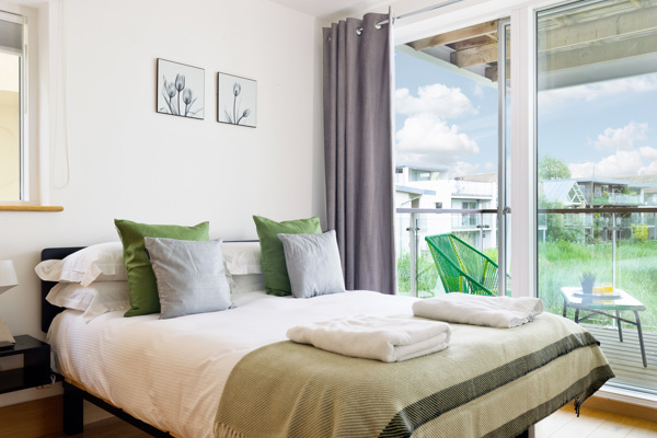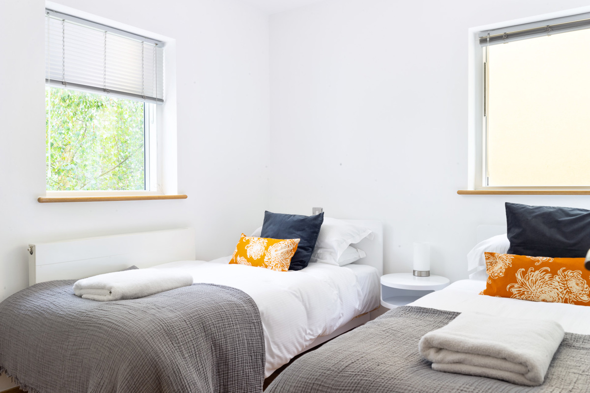 Tasteful prints adorn white walls throughout the property, creating an ambiance of holiday vibes and modern freshness. Venture up to the first floor, to discover a twin bedroom to the left with dual aspect windows and a standalone wardrobe, while the right hosts a sun-drenched second twin bedroom with a glass sliding door leading to the first-floor deck.