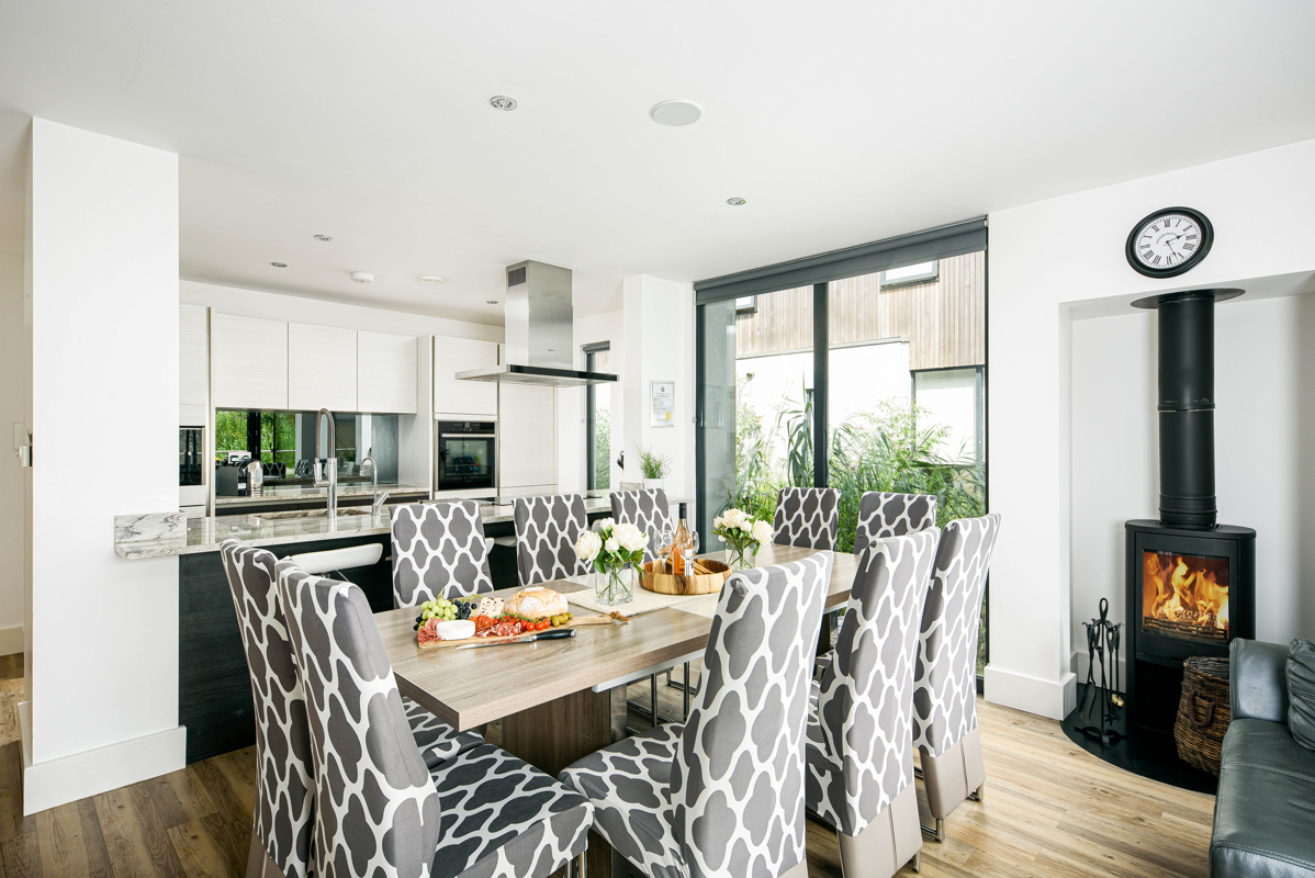 The kitchen features an electric oven, induction hob, microwave, fridge, freezer, dishwasher, and boiling hot water tap handy for a cosy hot cup of tea in front of the wood burner in the evening. A large dining table for ten connects the kitchen to the lounge and features a wall-mounted smart TV and a Sonos integrated Bluetooth sound system. The table and chairs seat 10, there are also 3 island bar stools.