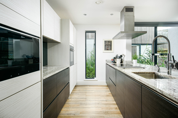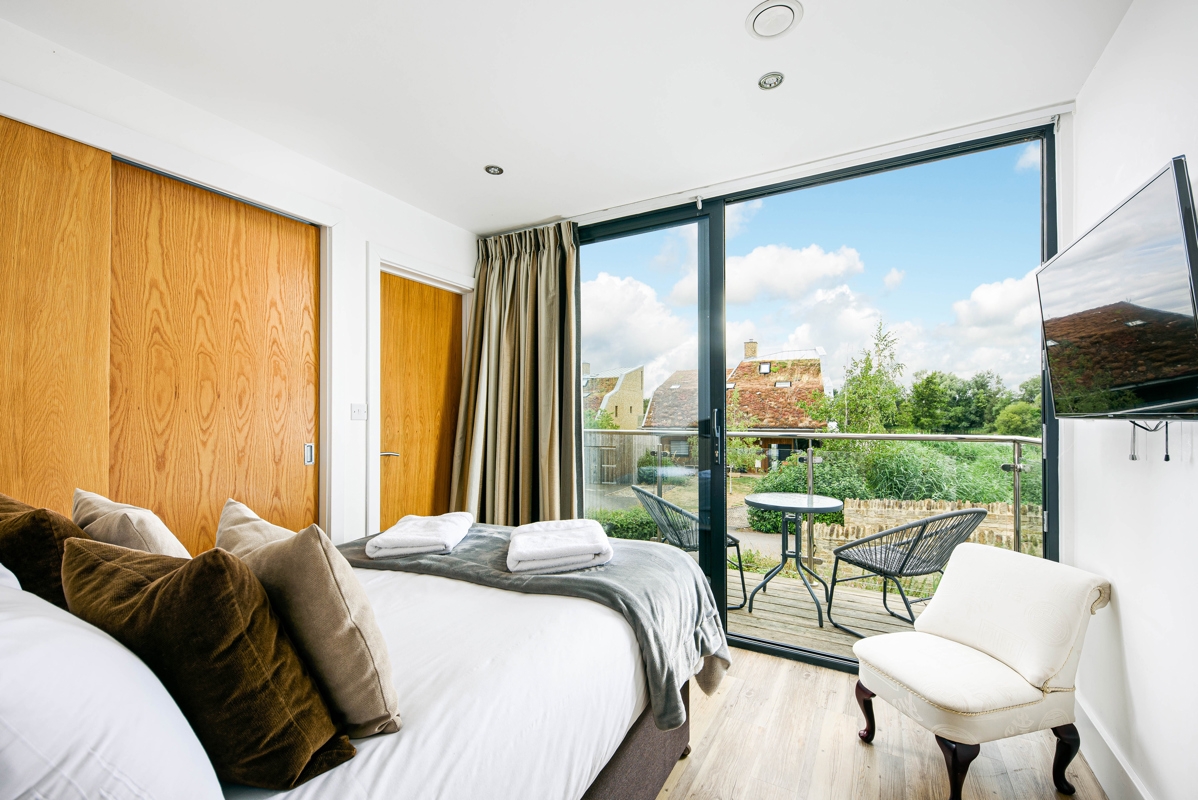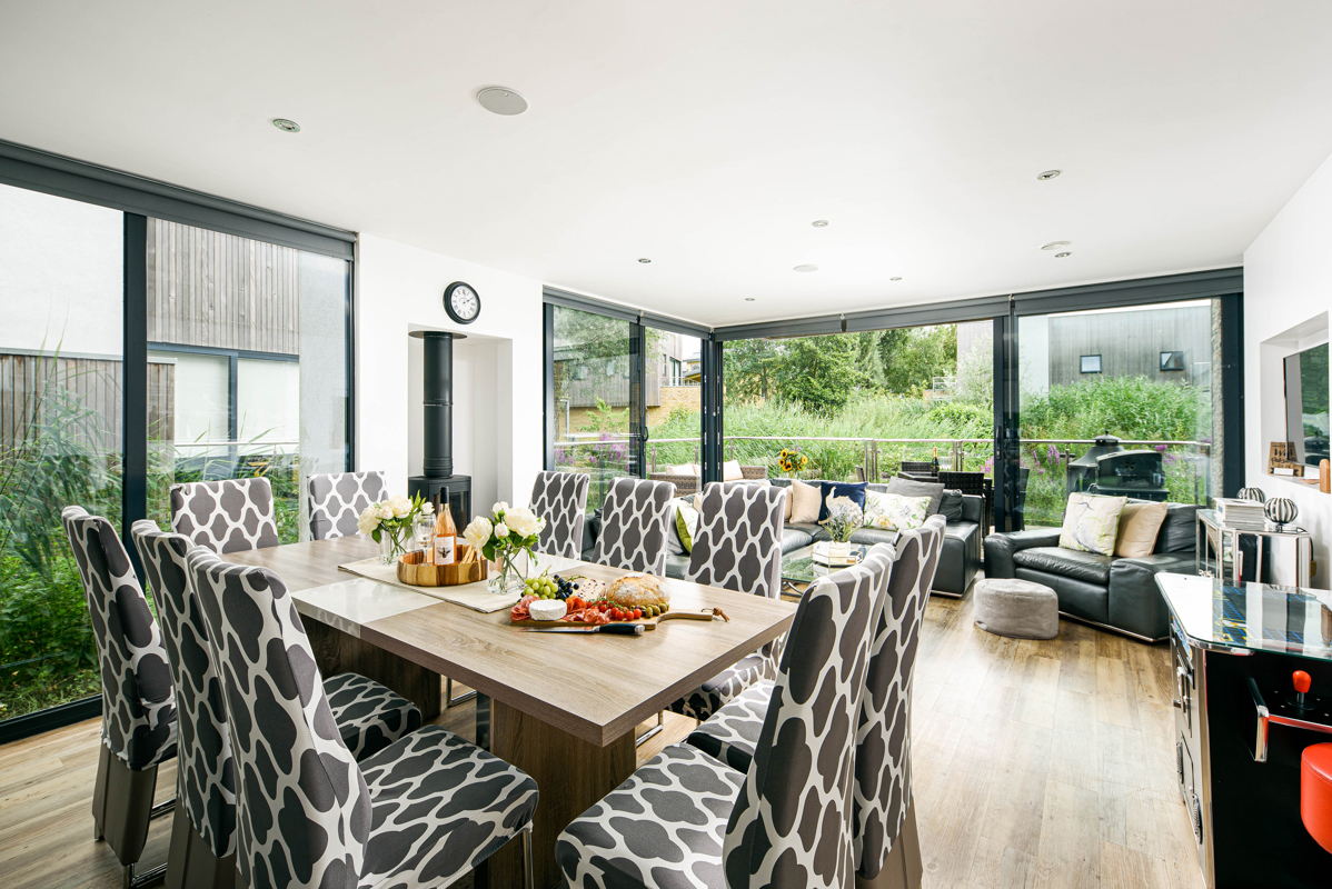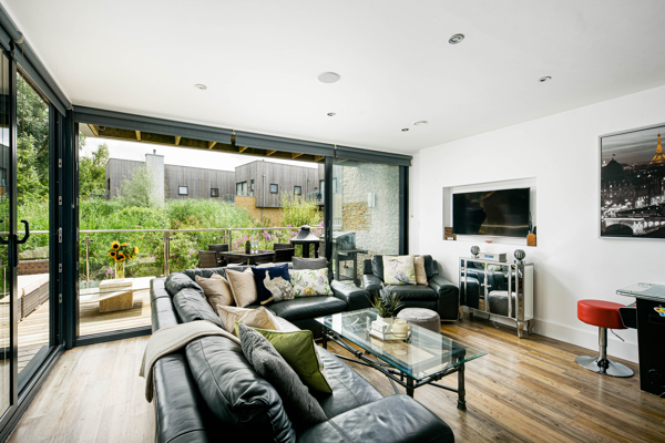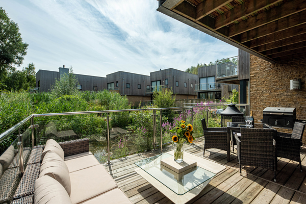 Sliding patio doors open out onto a beautiful terrace situated amongst the reeds and Water Garden. The outdoor lounge and dining table with BBQ make this extended ground floor living space complete.