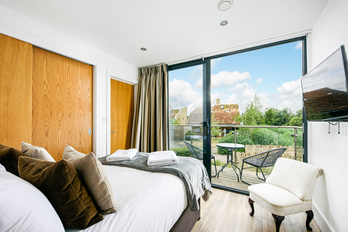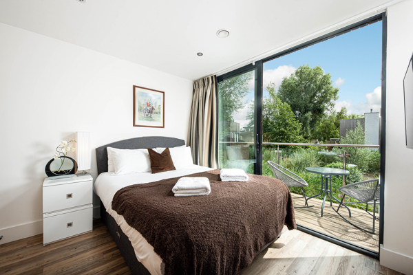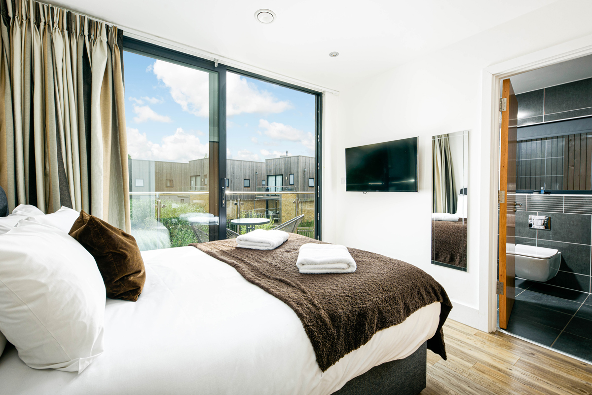 A double bedroom equipped with wall-mounted TV, built-in wardrobes, a light-filled en-suite with a spacious shower and toilet, and patio doors leading to a balcony with views out towards Spinney Lake.