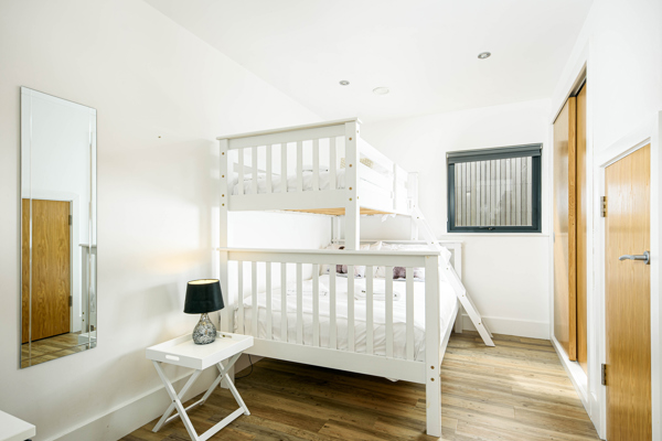 Also on the first floor, there is a twin bedroom with a built-in wardrobe and a chest of drawers. Another room with built-in robes and bunk beds featuring a double on the bottom.