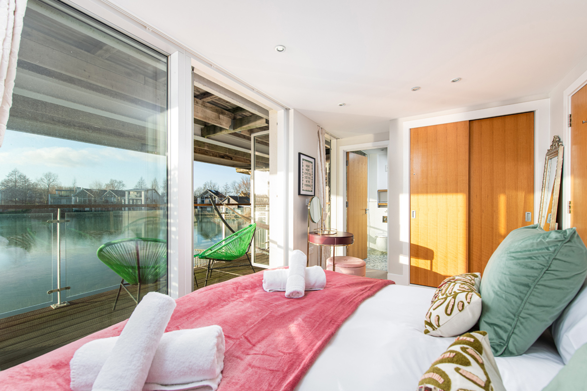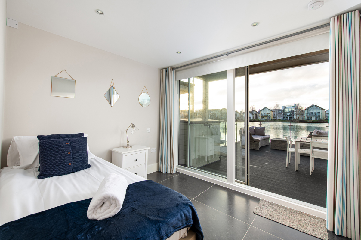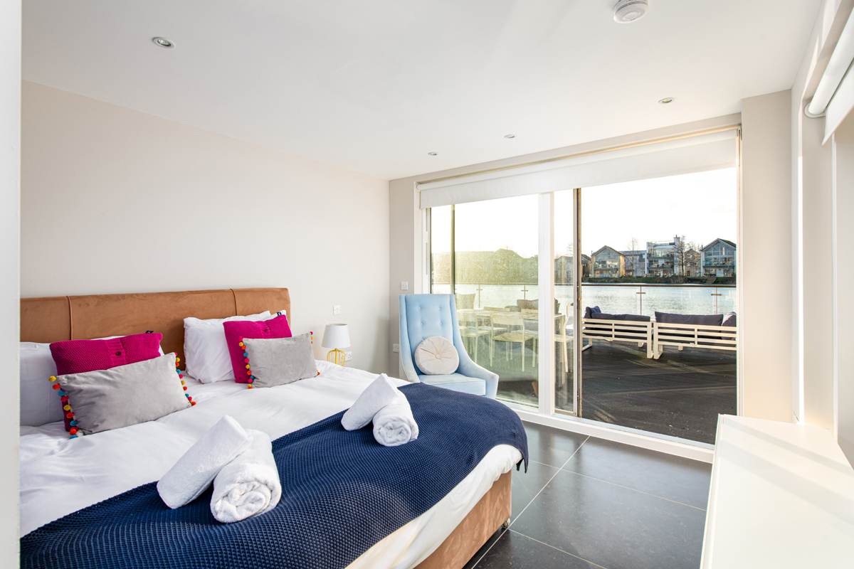 The principal bedroom offers stunning lake views and includes a super-king bed, ensuite shower room, built-in wardrobes, and access to a balcony—perfect for enjoying the scenery.
