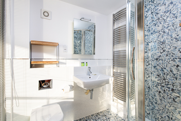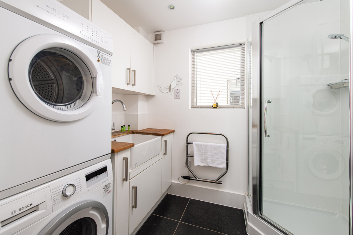 The hallway leads to a practical utility room, which includes a washing machine and tumble dryer, as well as a shower and WC.