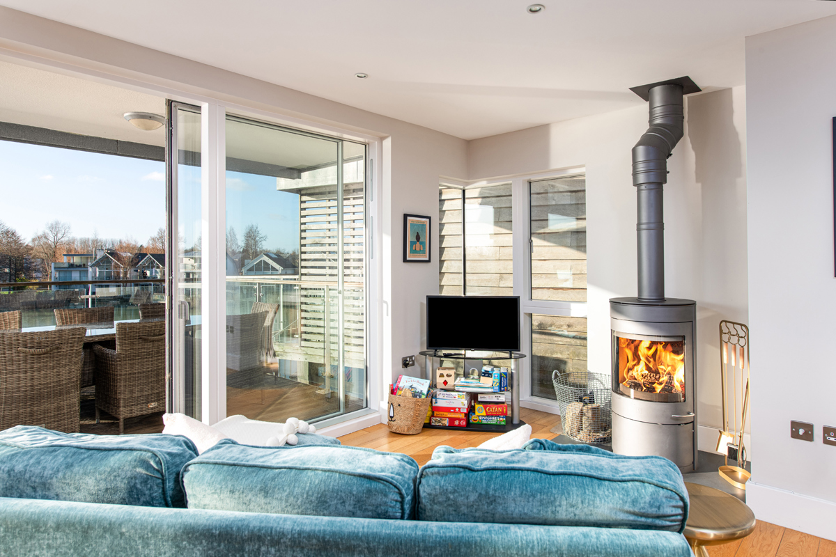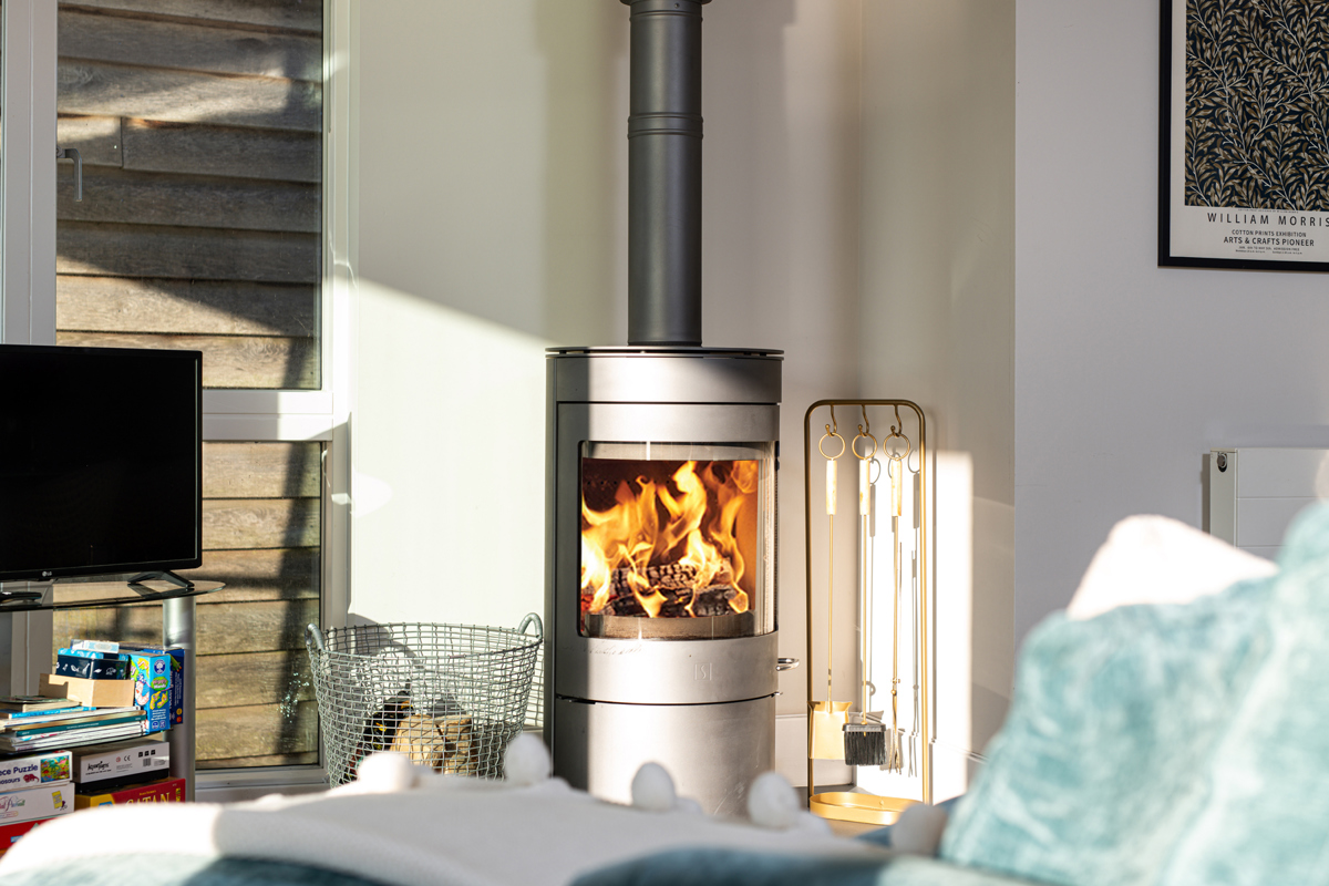 The main living area can be enjoyed with the warmth of the wood burner on cooler days, or simply by relaxing on the sofa, taking in the views, and enjoying time together.