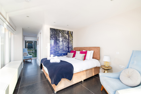 Upon arriving at Mayfleet, you'll find the first two of the five bedrooms located on the ground floor. To your left, the entrance to the first bedroom wraps around the side of the property, featuring a super king-size bed, built-in wardrobe, ensuite shower room, and access to the rear decking.