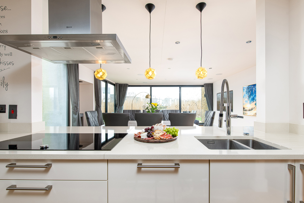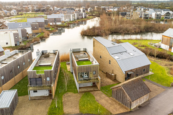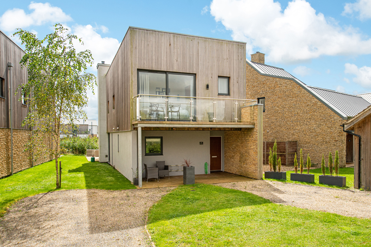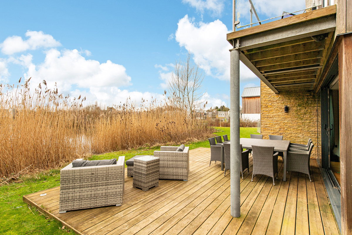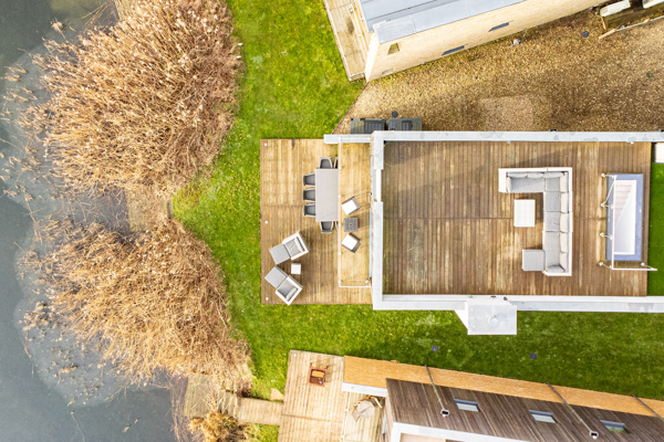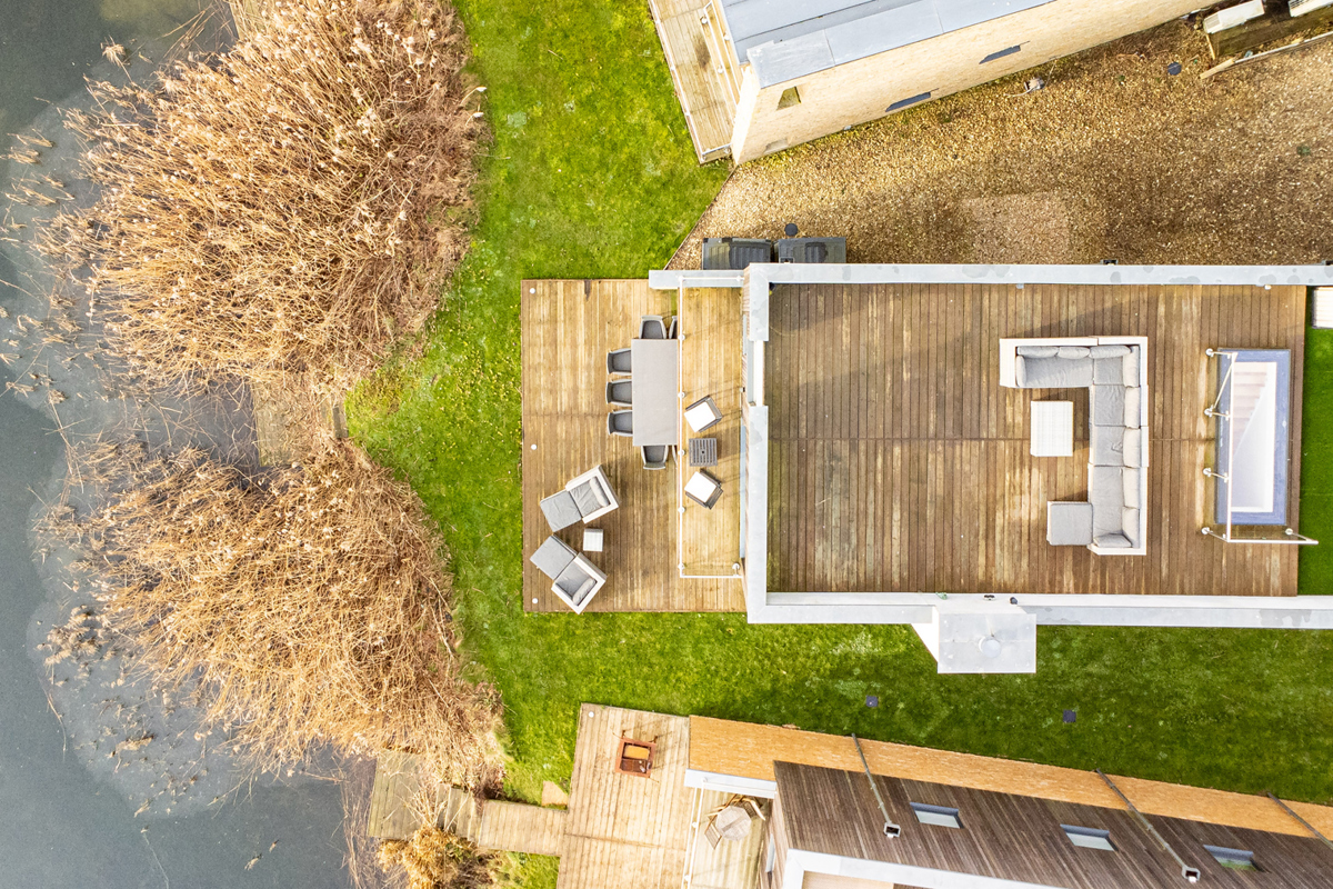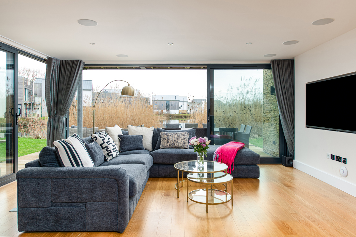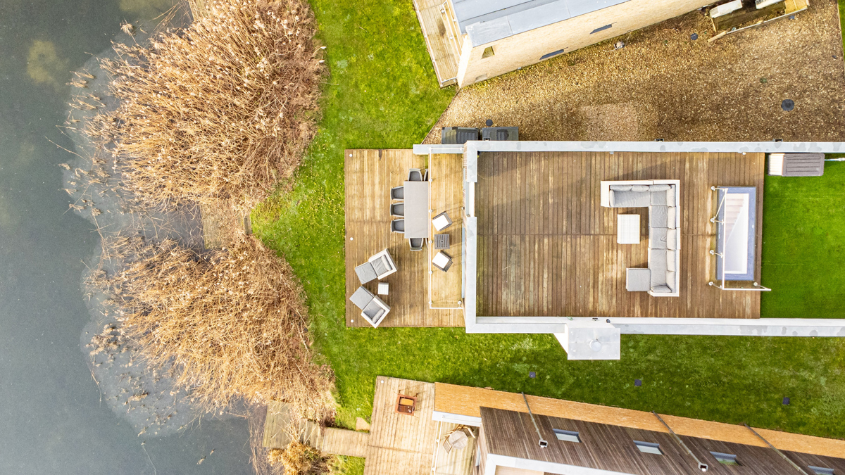 Dual aspect ceiling to floor glass sliding doors seamlessly blend indoor and outdoor living, revealing a generous timber deck with outdoor modular seating and grand BBQ. Here, you’ll feel as though you’ve almost found your own corner of Minety Lake, where beyond the deck is a beautiful grassy space with private lake access via a jetty, inviting leisurely moments.