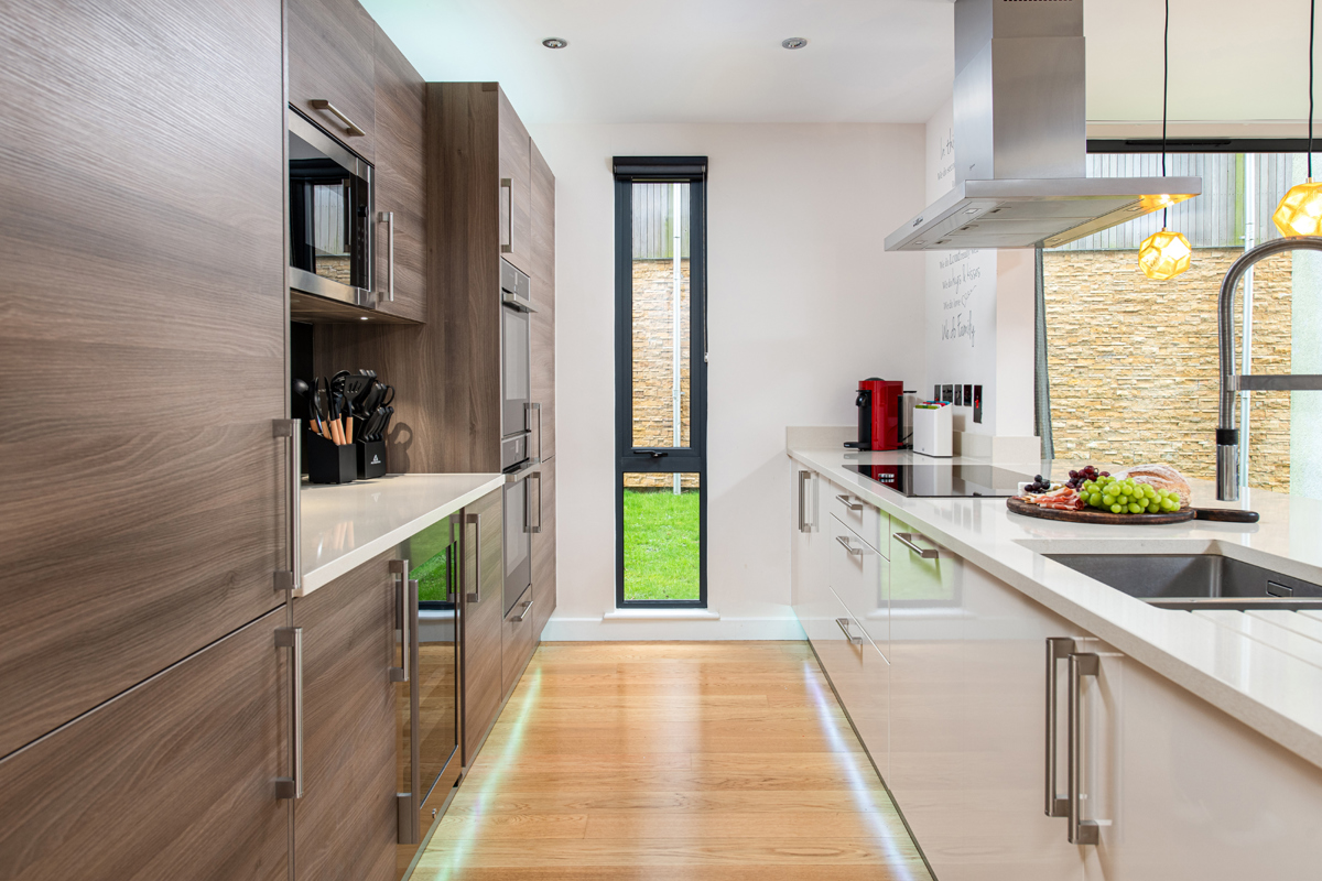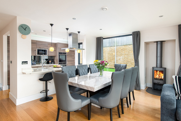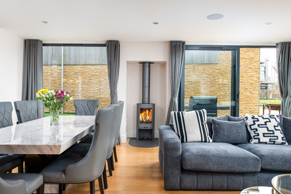 The heart of this lakeside haven is the galley-style kitchen, seamlessly integrated into an open plan living room. The kitchen offers a wide range of built-in NEFF appliances including two ovens, a microwave, a fridge freezer, a dishwasher and a wine cooler. There is also the convenience of a Nespresso Vertuo Plus coffee machine. Gather around the dining table or on the bar stools at the wide breakfast bar, where culinary delights are prepared with ease. Relax on the expansive sofa, in front of the wood fire burner, and enjoy entertainment on the large wall-mounted TV.