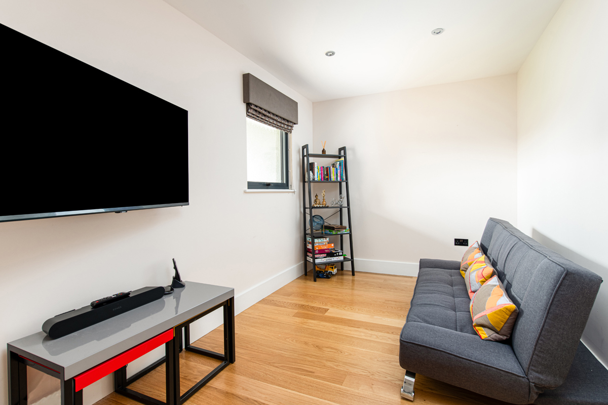 The spacious entry hall leads to a snug room complete with TV, making it the perfect spot to unwind with a movie or get lost in a captivating book.