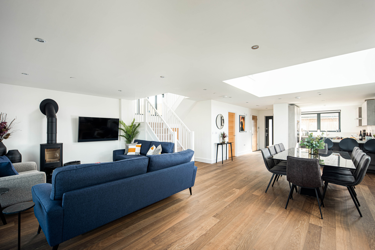 As you enter Minety Lake 72 you are greeted by a beautiful open plan area, home to the bespoke kitchen, featuring a Nespresso Vertuo Plus Coffee machine, lounge and dining areas, perfect for hosting your meals and kicking back and relaxing in front of the smart TV. The TV is Sky Glass and the lounge is completed by a log burner. The dining area comes with a table that seats 10-12 and a breakfast bar for 3. Also on the ground floor is a large W/C and a utility room equipped with an additional fridge, washing machine and tumble dryer. There is also plenty of additional storage space throughout the house for you to utilise during your holiday.