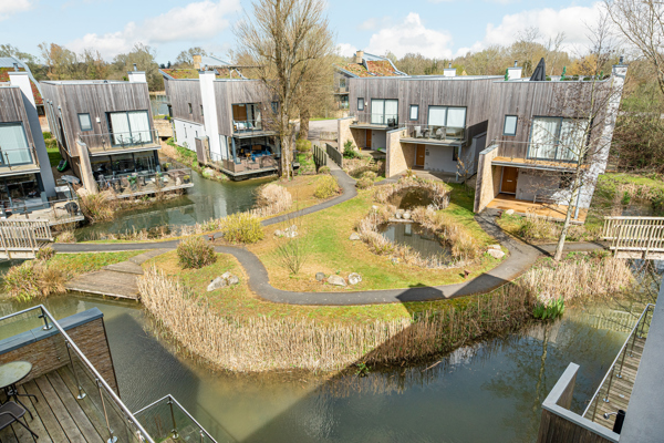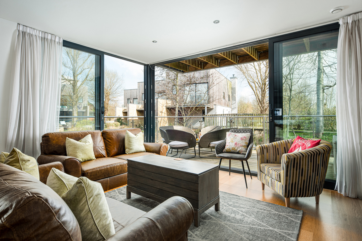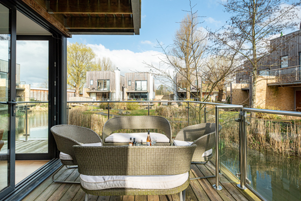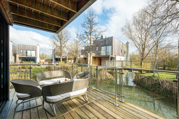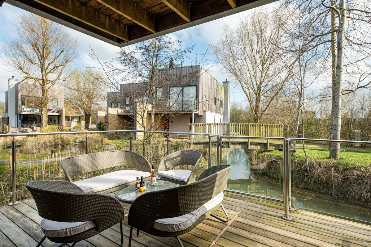 Neptune Lodge is located in the Water Gardens at Lower Mill Estate. The back decking looks out onto the Water Gardens, a secluded area perfect for enjoying a morning coffee.