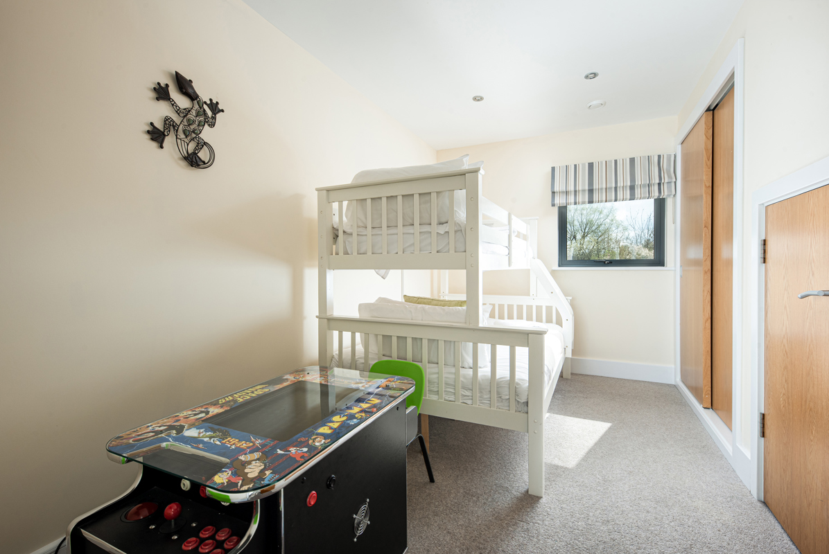 Upstairs there are four bedrooms. Two double bedrooms with en-suites. A bunk room with retro games console and a twin bedroom with two 2'6 wide. There is also an additional family bathroom.