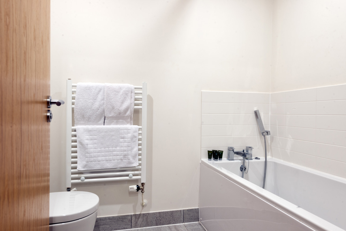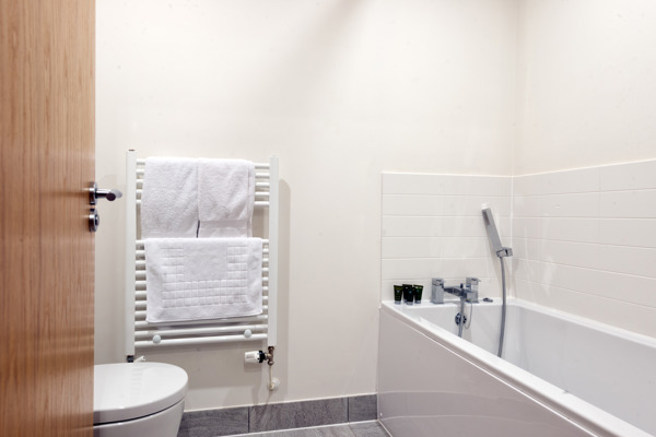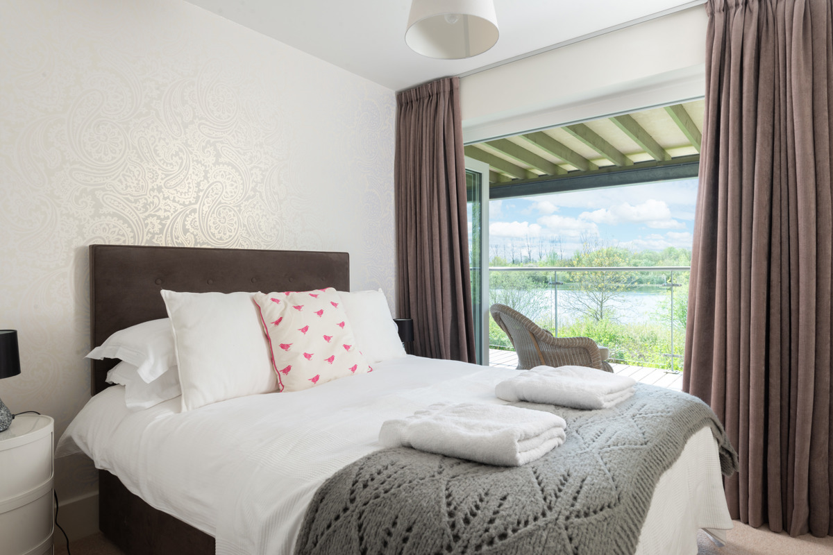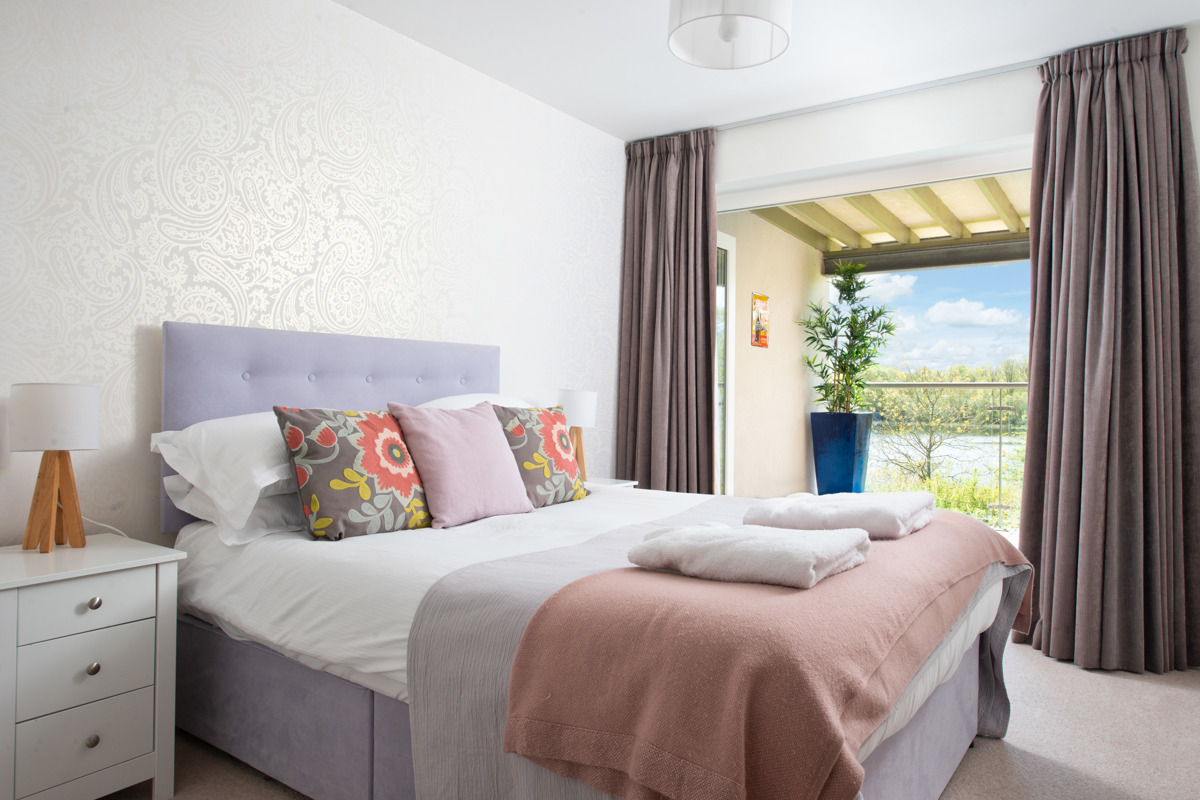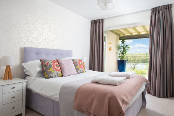 The first of two bedrooms is the master double bedroom with an en-suite shower room that has a rail to help accessibility in and out of the shower. Double doors from the bedroom open out onto the balcony overlooking Swillbrook Lake with an armchair in the corner of the room the perfect spot to relax and take in the views of the apartment.