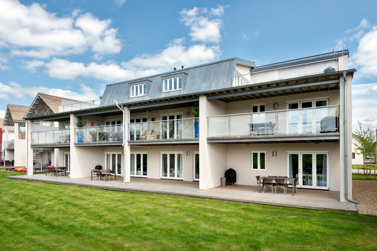 Continue forward over the bridge taking the immediate right towards Howells Mere and Clearwater properties. Continue along this road and you will get to a point where the road splits off either left or right. Bear left and continue along the road passing the Spa and Tennis courts on your right and houses on your left. At the end of this road, you will see a bridge in front of you. Cross over this bridge into Howell's Mere and turn right through a couple of wooden gates. Follow the road on until you reach the Leda apartment block on your right-hand side. Your parking spot is right in front of the apartments numbered 109. Your apartment is on the first floor of the Leda apartment block.