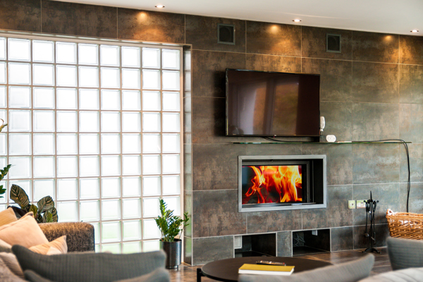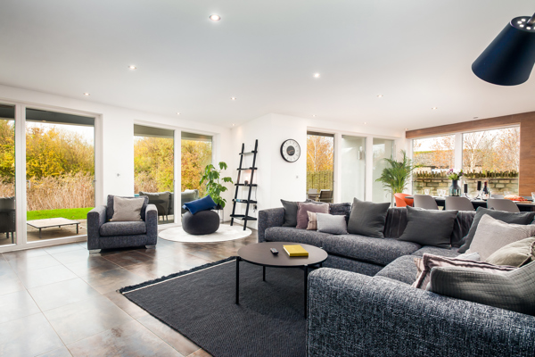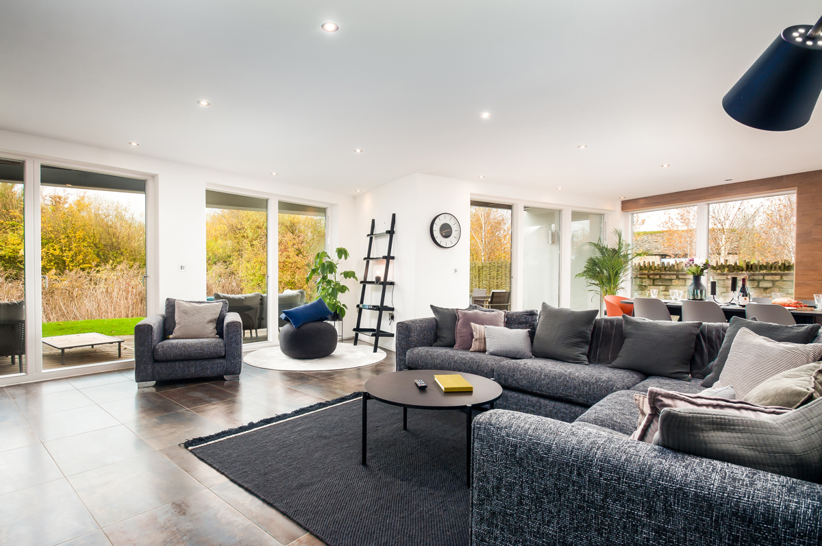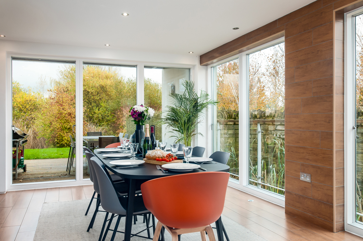 Spacious lounge with wood burner, two sofas, two armchairs, and wall-mounted flat-screen TV leading onto an enclosed deck area and a lawn enjoying views over Somerford Lagoon. The dining area also overlooking Somerford Lagoon seats eight.