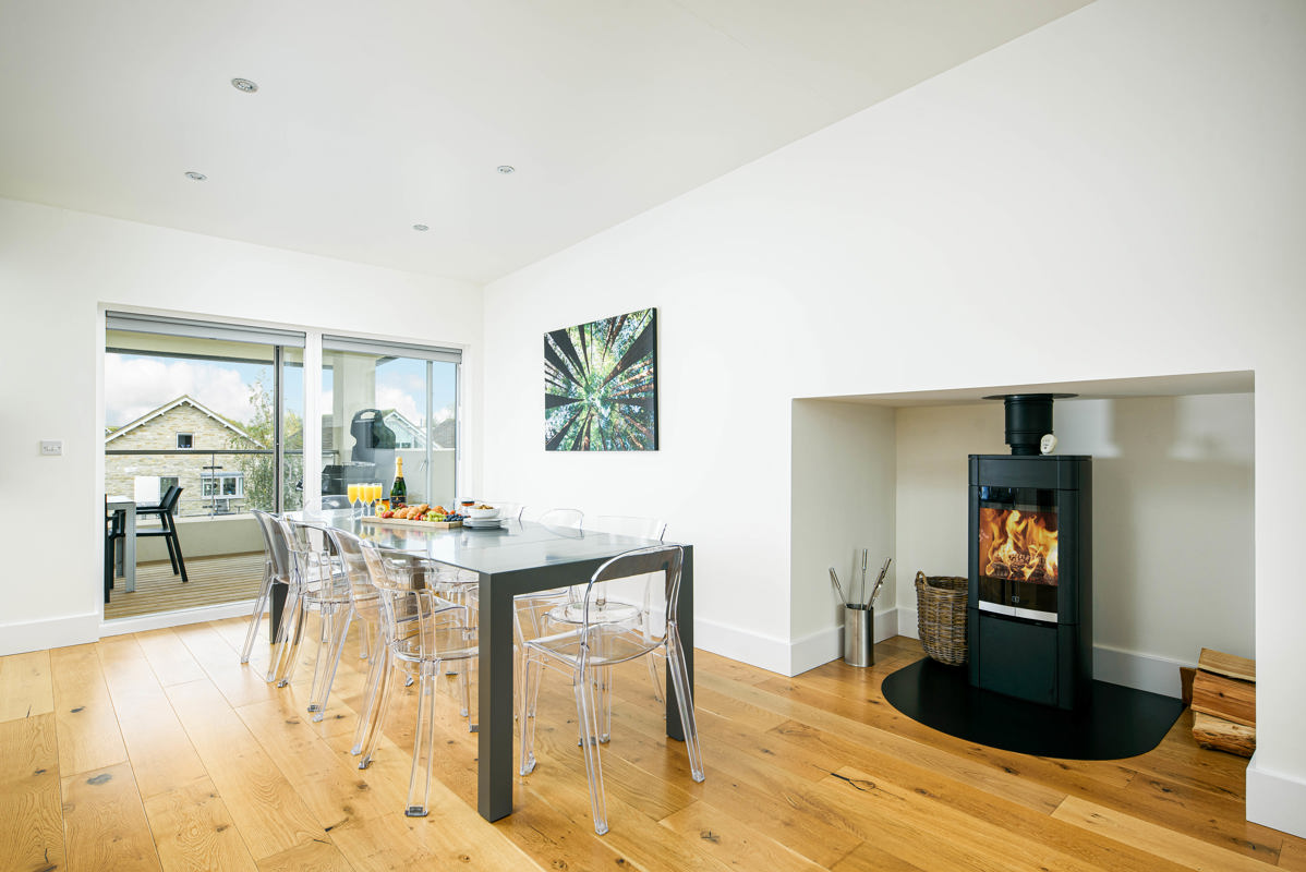The dining table for ten guests offers a lovely space to gather. An enclosed balcony off the dining area provides yet another dining table (seating six guests) for soaking up the morning sun and the Howells Mere ambiance.