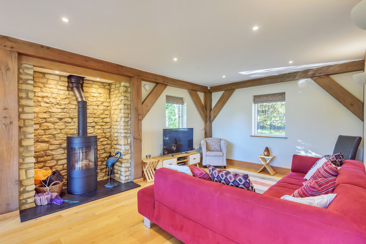 Living area with sofa, wood-burning stove, and smart TV with Sky.