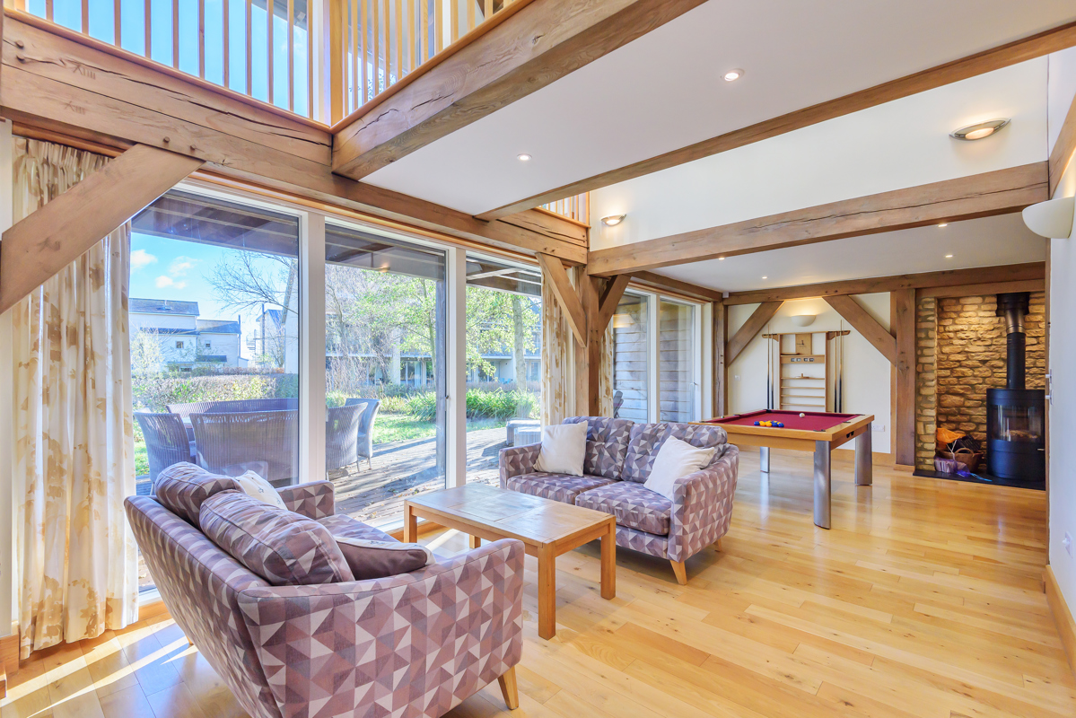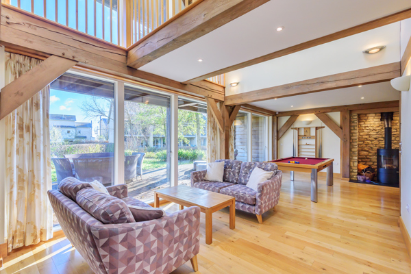 Dining table and chairs, sliding doors leading to the rear decking. A seating area and pool table.