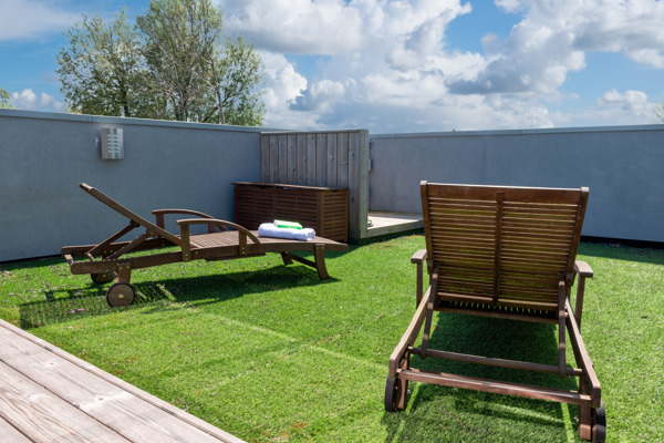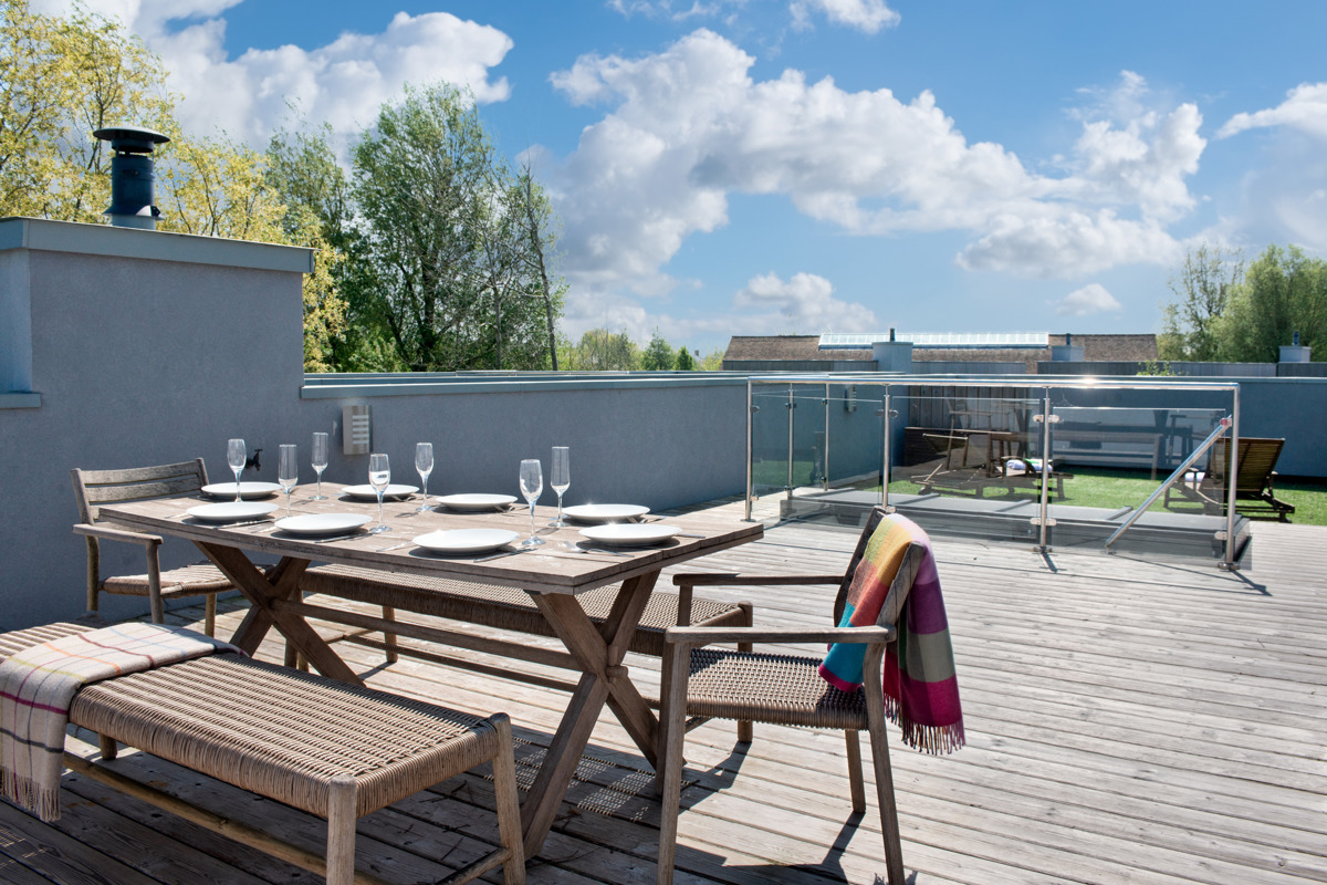 Roof terrace – accessed from the first-floor landing via an electrically operated roof light. Two sun loungers, a garden table, and a bench.