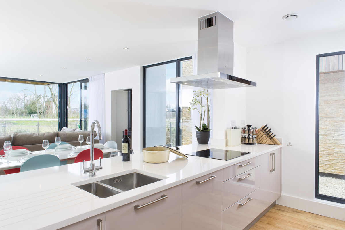 Heating is via air source heat pumps, heat recovery system, and underfloor heating, which is further supplemented with a wood-burning stove in the living area.