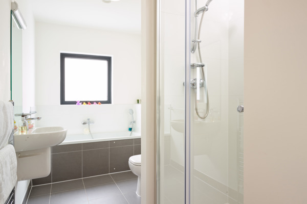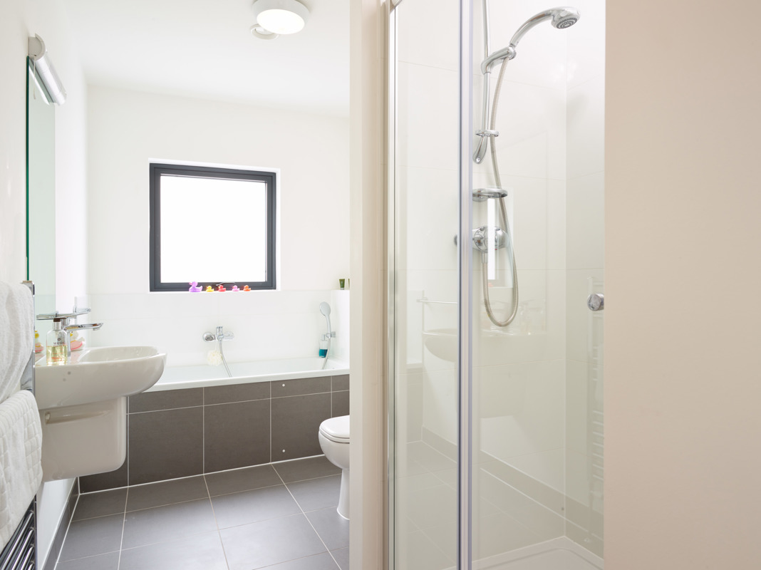Family bathroom – Separate shower cubicle, bath with shower attachment, WC, and hand washbasin.
