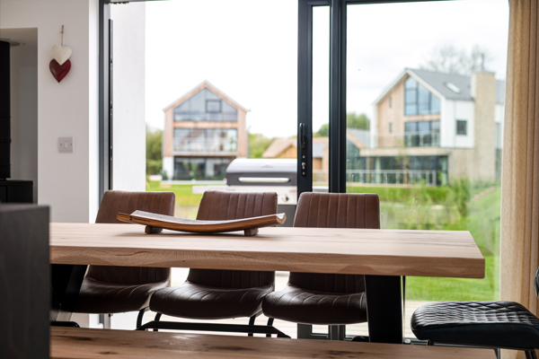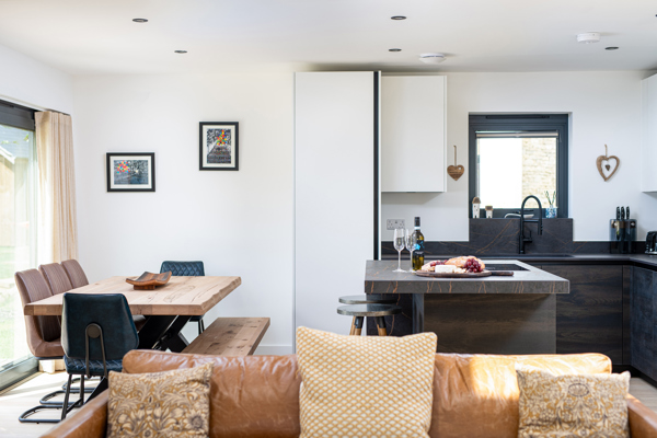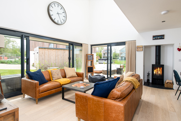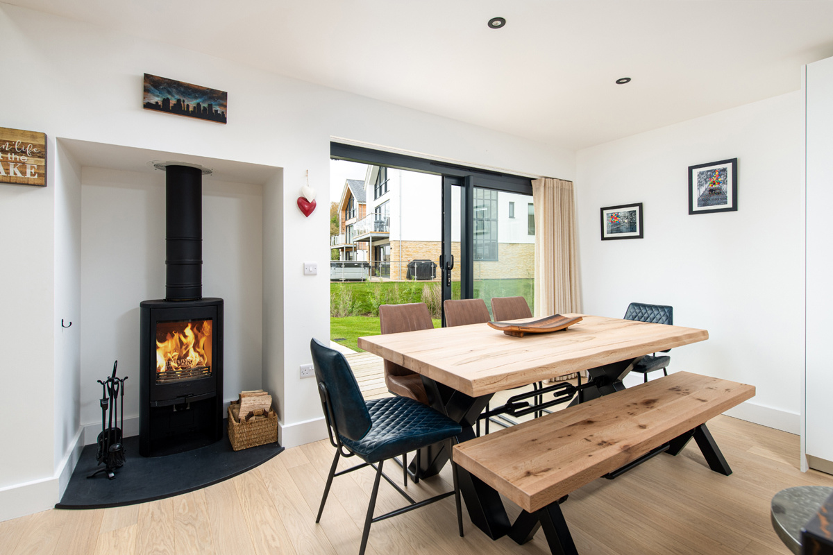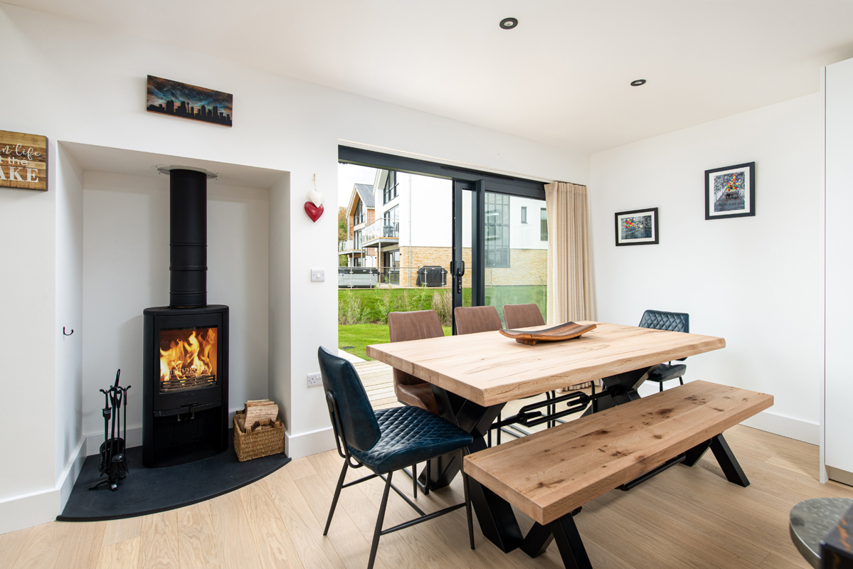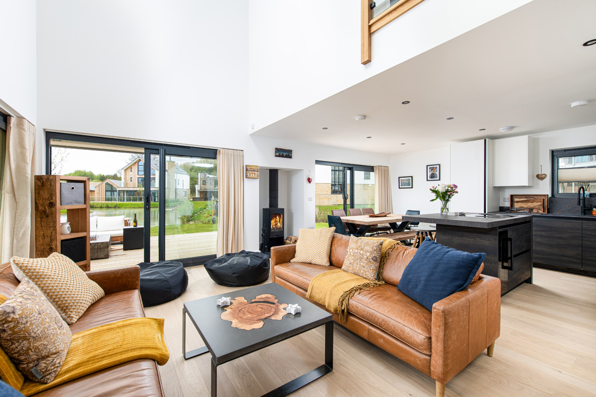 The lounge has two lovely leather sofas and a couple of bean bags that are great for children. There is a large smart TV that you will be able to log into your own streaming accounts such as Netflix, Amazon Prime, and Disney. There is a log burner perfect for lighting in the winter months to make the lounge feel even cosier.