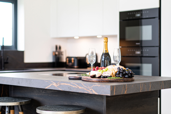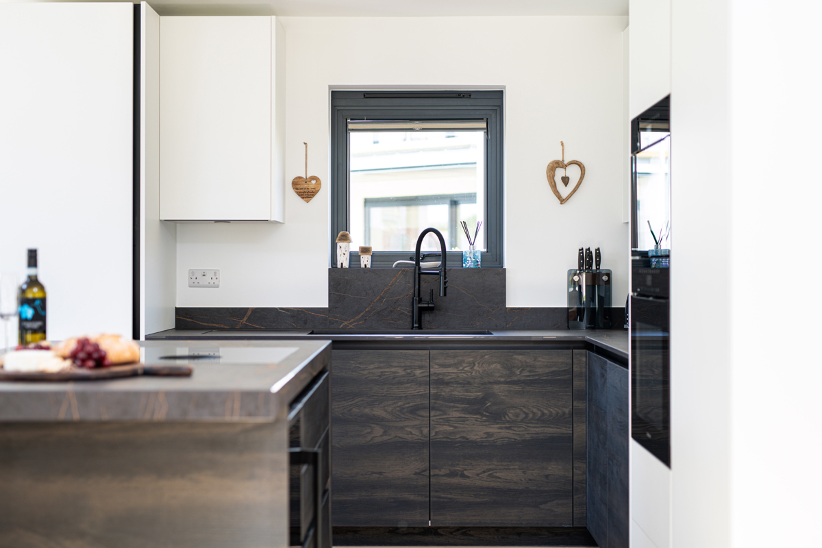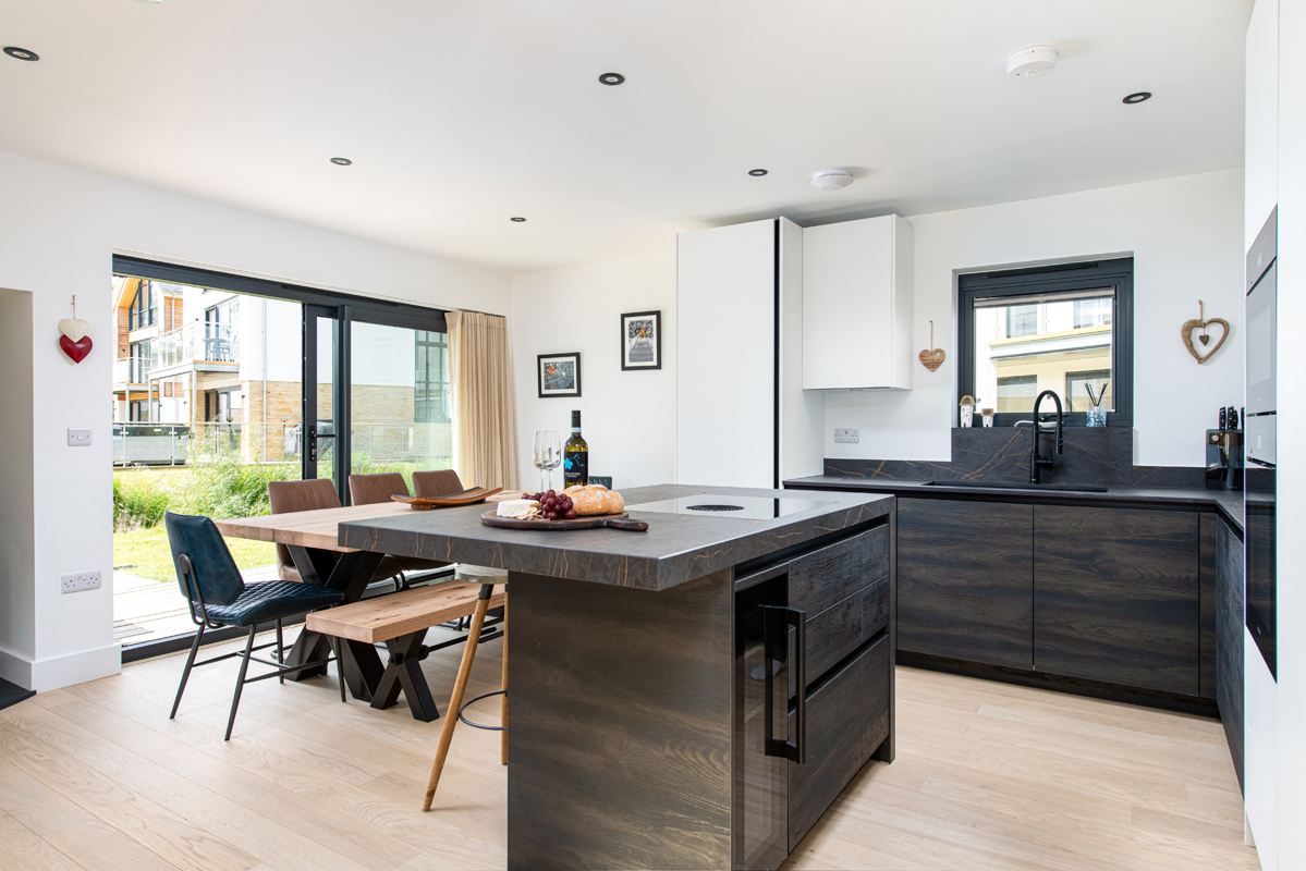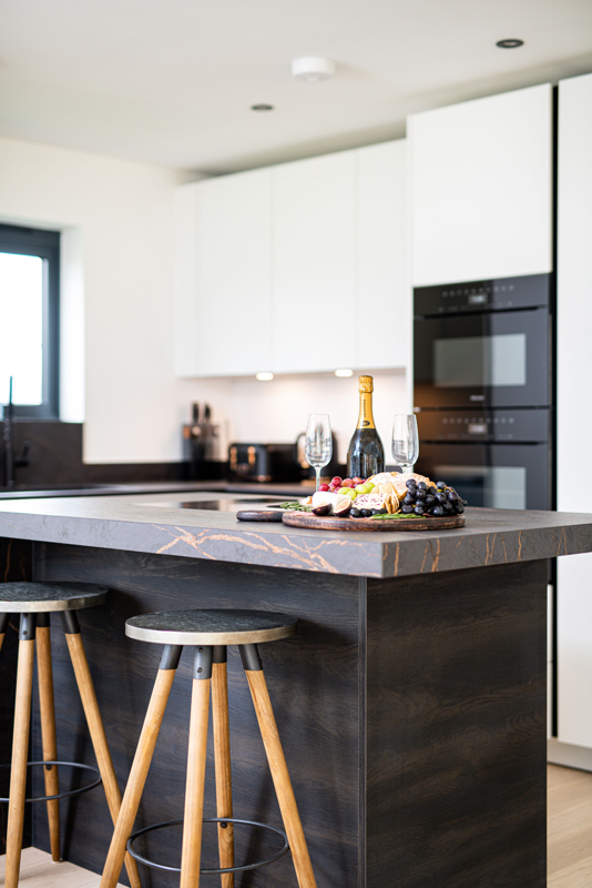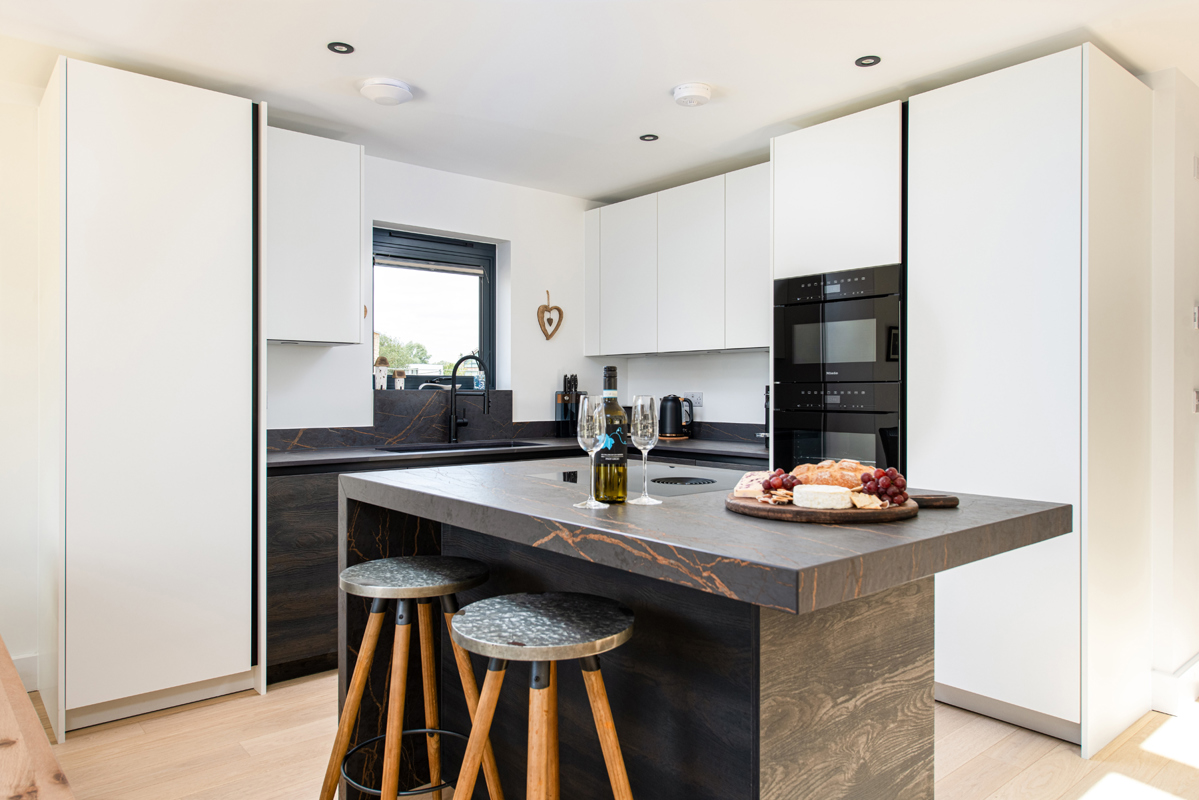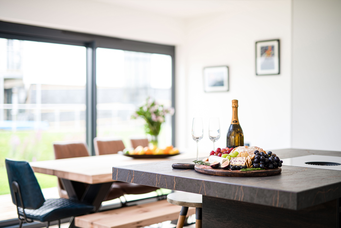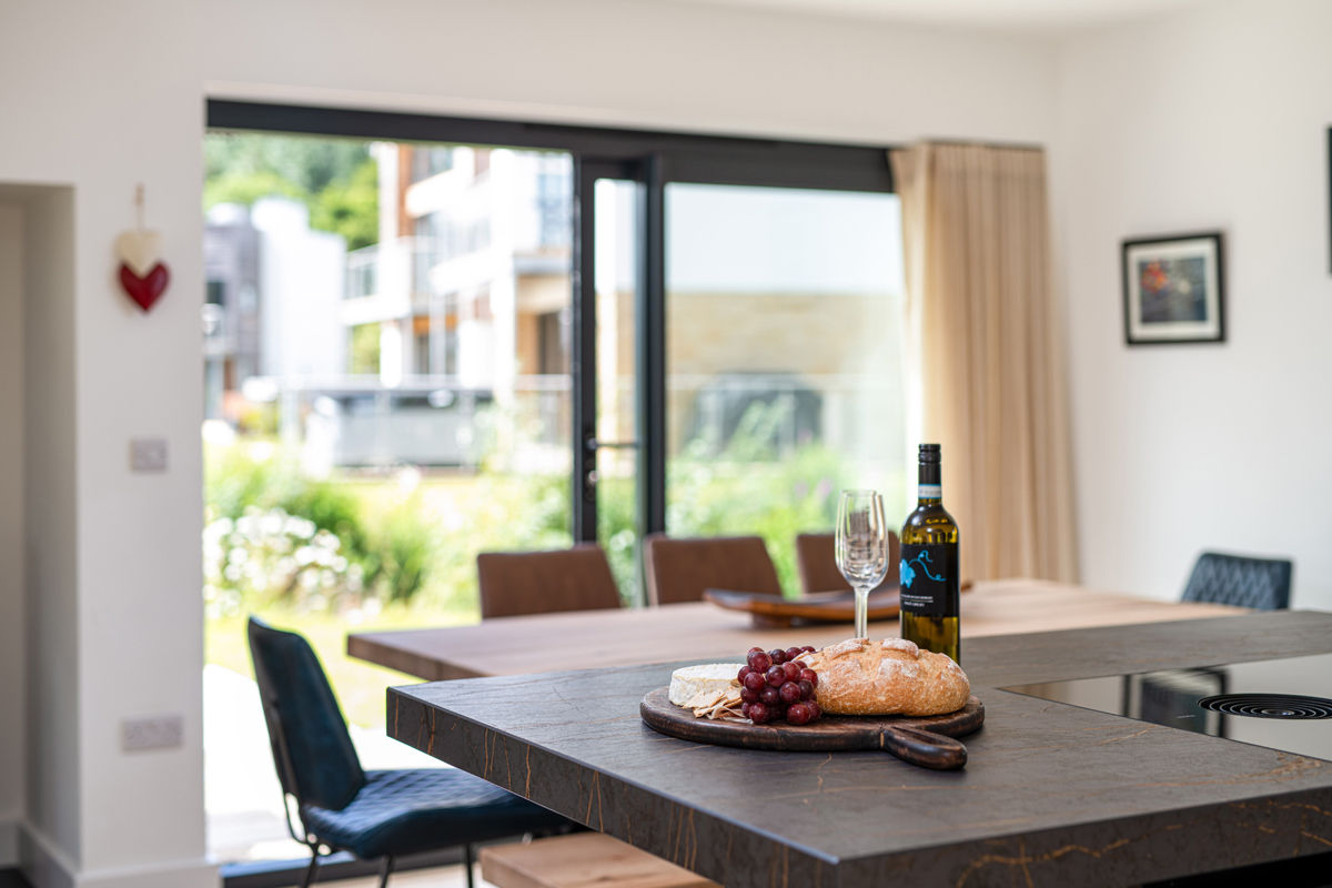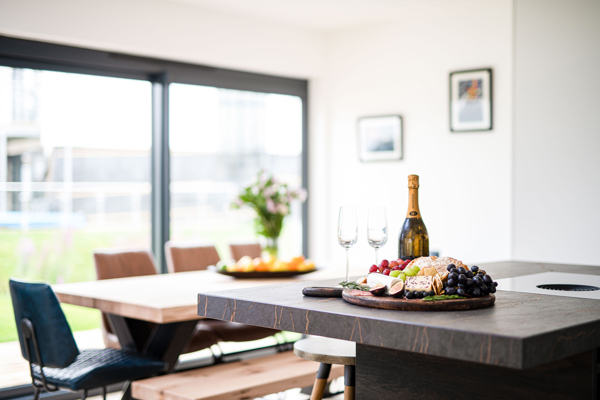 To complete the ground floor is a fantastic open-plan kitchen, dining, and lounge area. The dining table seats 8 and as a bonus there is also a beautifully designed kitchen island with two bar stools and an induction hob. The kitchen itself is kitted out with a Miele oven, microwave, dishwasher, and fridge. There are all the appliances and utensils needed for you to make the most of this self-catered accommodation and there is the bonus of a Siemens wine fridge.