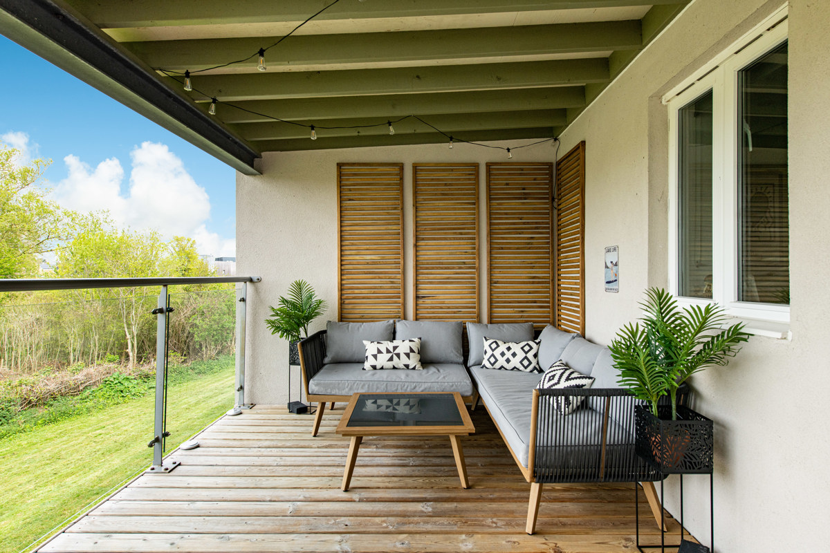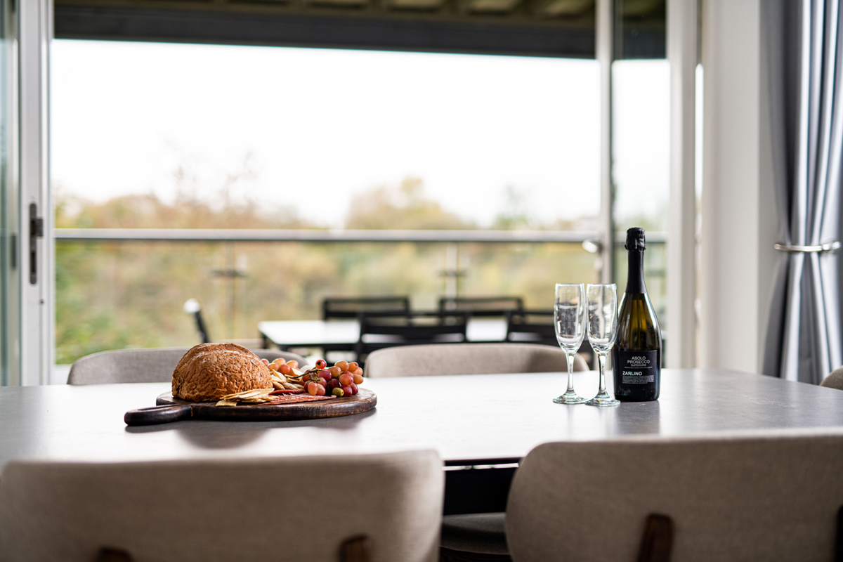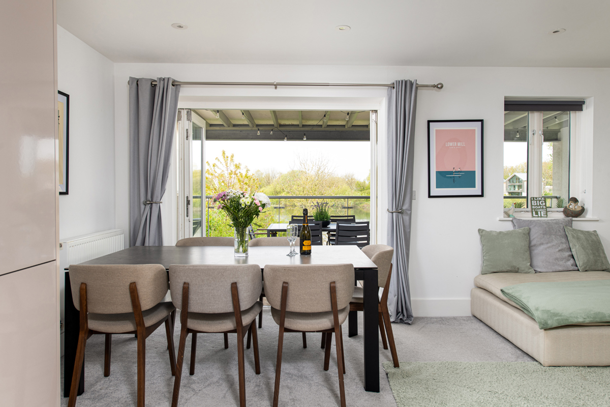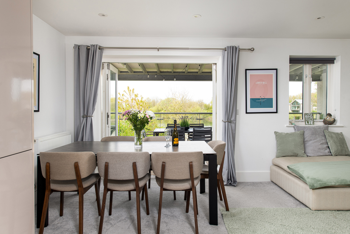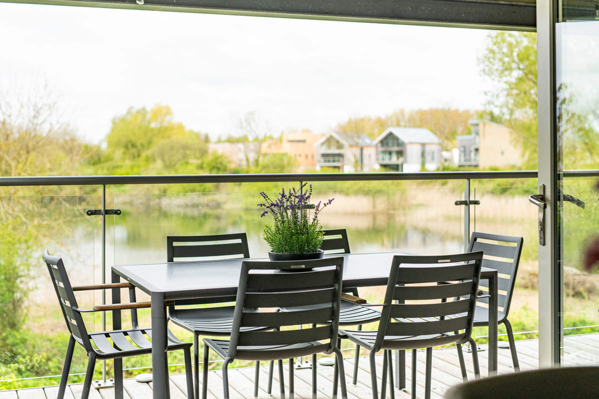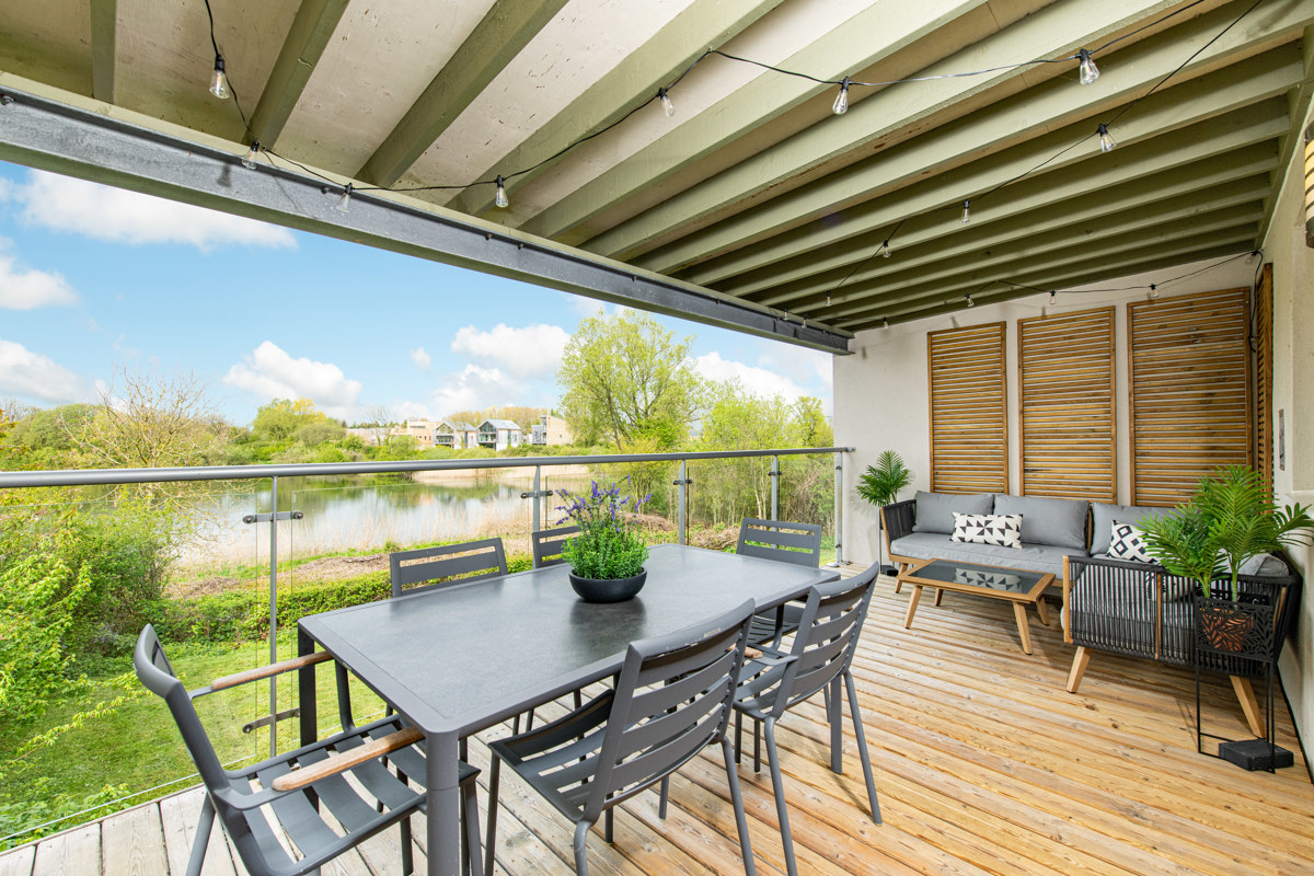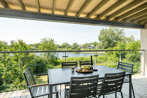 A spacious balcony decking looks out over Swillbrook Lake where you can watch the sun setting while enjoying your meals.